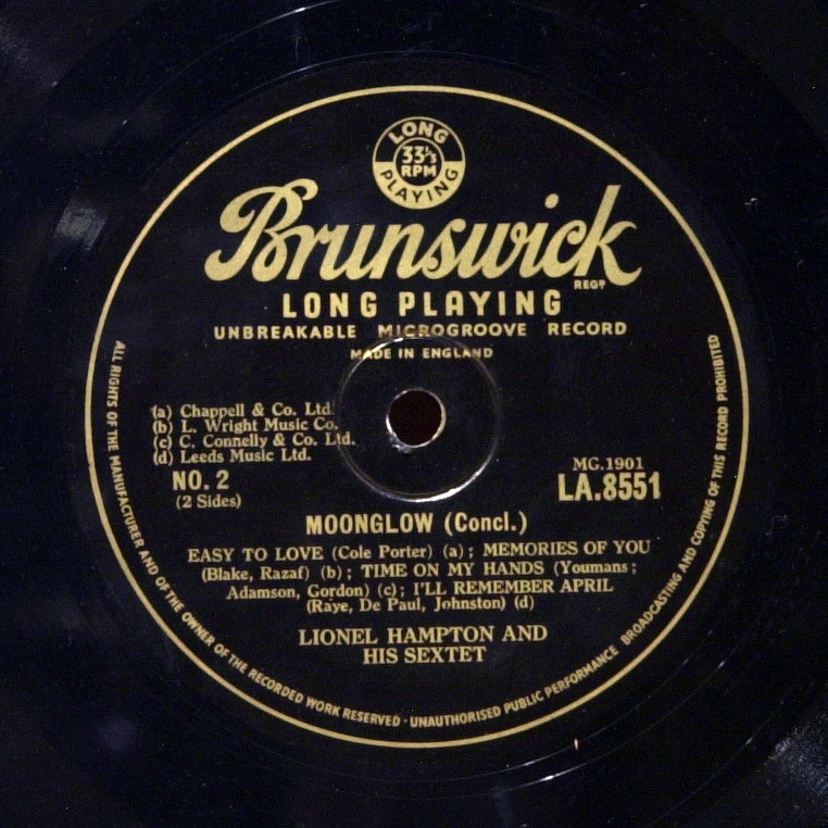 Lo-Fi, аудиофильская запись. Переиздание 1951 года, 10′ английский LP Brunswick, оригиналы на 78 оборотов Decca, 1940е годы. Удивительно приятная по атмосфере пластинка, Хэмптон не виртуоз, а поэт виброфона, какая у него трогательная версия «Time on my hands»! Секстет отличный, никто не мешает солисту, как это часто бывает в демократичном джазе.