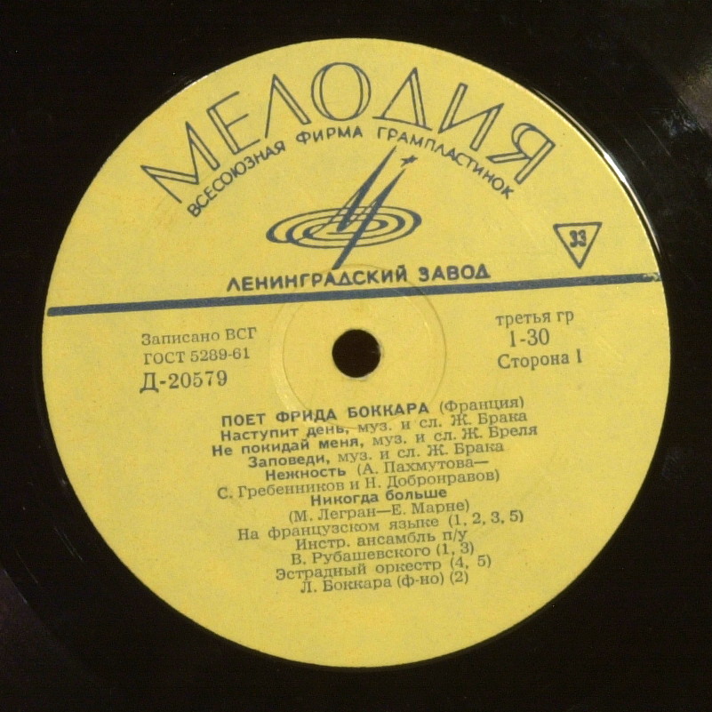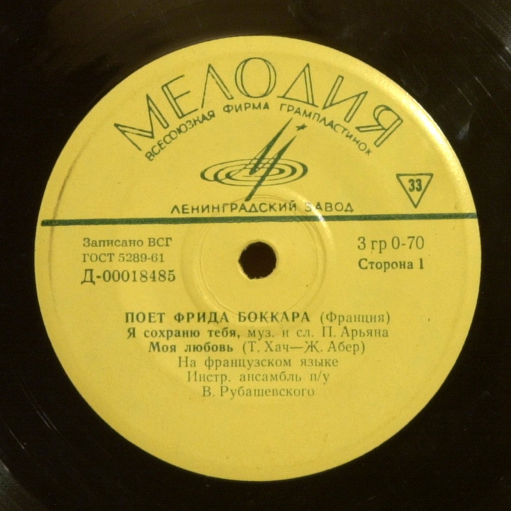 Две пластинки Д-18475-7′ и Д-20579-10′. Записи 1966 года, сделаны в не плохой студии, Фрида поет в сопровождении инструментального ансамбля В. Рубашевского. Поражает разброс качества записей, как будто кто-то экспериментировал с оборудованием. Судя по звучанию вокала на Д-20579, Фриде по блату поставили какой-то советский динамический микрофон, голос зажат. На форте где Фрида поет на некотором удалении, звук зажимается еще больше (несомость звука никакая). Апофеоз такой записи — «Нежность», Фрида поет с чувством, акцент смешной, но оркестр звучит отлично! Удачно сыграна «Мужчина и Женщина», по качеству, как нарочно, хуже всего.