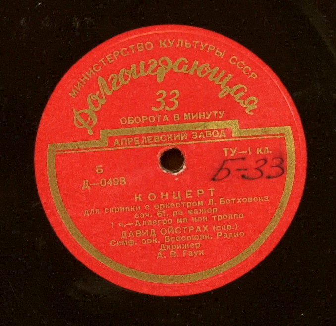 ТУ-1кл с маленьким красным яблоком — первые советские долгоиграющие пластинки, их звучание на удивление противоречиво: оркестр звучит зажато, резко, в то время как солирующие инструменты звучат ясно, чисто и с невероятно тонкими интонациями. Ойстрах и его Страдивари в прекрасной форме, на этой записи, как впрочем и на большинстве других записей тех лет, они — единое целое, создающее музыкальное повествование, интересное от начала и до конца. Ойстрах начинает играть с третьей минуты и дальше уже не отпускает.