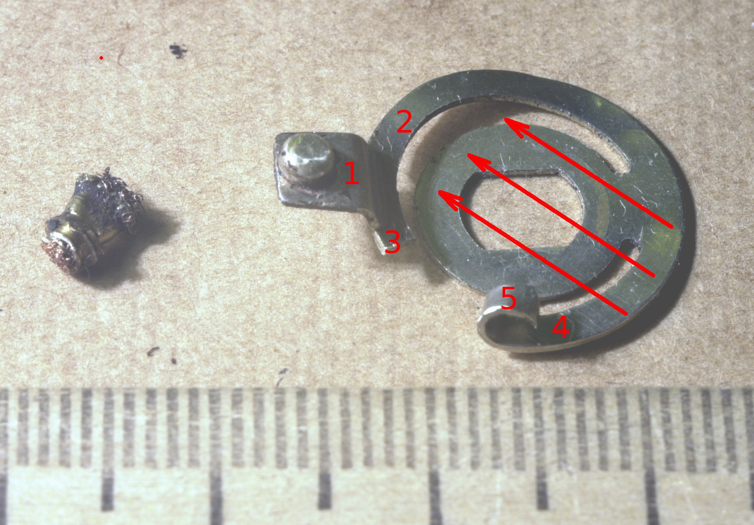 На фото показана доработанная деталь от старого регулятора громкости — штампованная из латунного листа пружина, которая точкой 5 касается контактной площадки движка потенциометра, а точкой 1 — графитовой дорожки. Изначально в пружине был сделан только разрез без загиба в точке 5 (см фото), то-есть контактной площадки движка потенциометра касалась точка 4. Задача была в том, чтобы получить наиболее чистый звук соединения движка с графитовым покрытием, то-есть, от точки 4 к точке 1 или в крайнем случае от точки 2 к точке 1 (эта версия требовала некоторой переделки конструкции резистора).