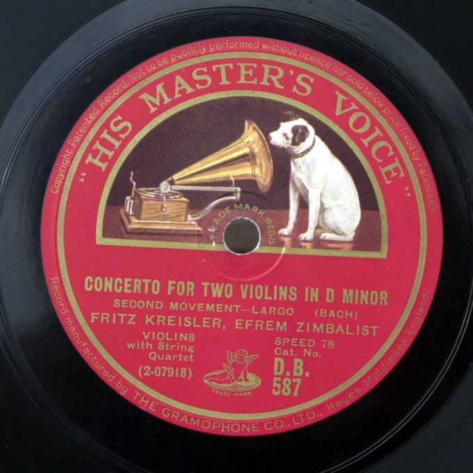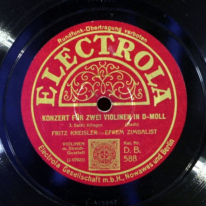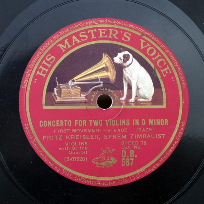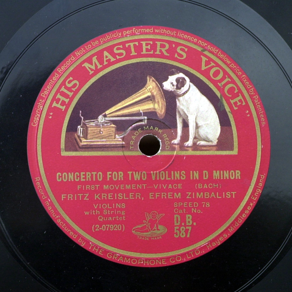 Переиздание 1930х, две пластинки из разных комплектов — трескучий HMV и чистая Electrola. Уникальная по характеру версия концерта 1915 года — акустическая запись с камерным аккомпанементом, сохранившая в оригинале необычайно слитные созвучия и аккорды, построенные двумя прекрасными скрипками и квартетом. Повествование идет по нарастающей — задающее настроение vivace, необычайной красоты Largo и страстное, божественное Allegro.