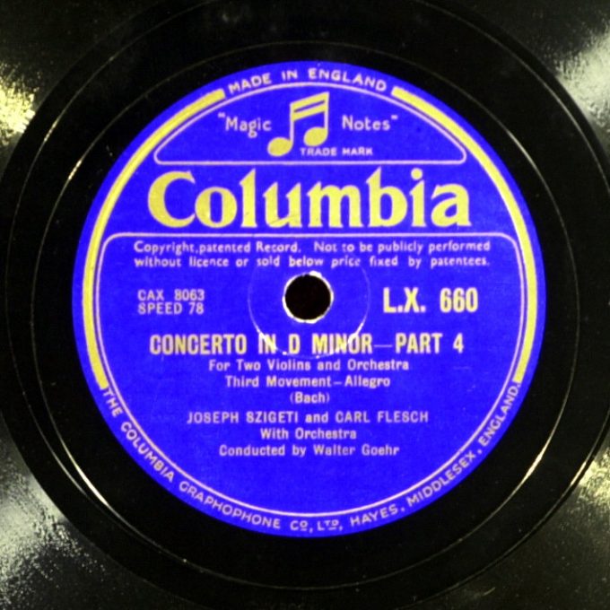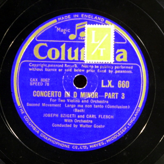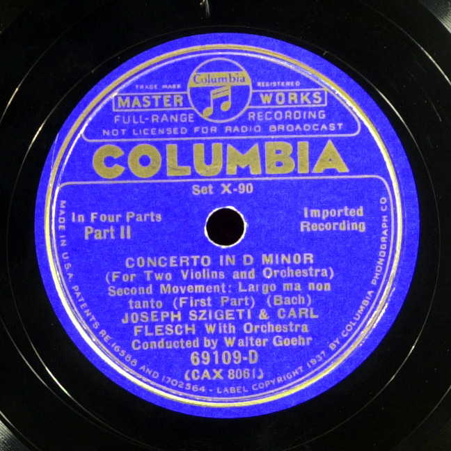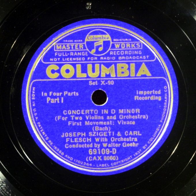 Сборный комплект пластинок 1937 года, первая пластинка из США записана с серьезными потерями ясности, звук второй, английской версии великолепен, но она отпечатана на трескучей массе HMV. В первой части по достоинству можно оценить скрипку Сигети с ее подчеркнутой верхней формантой, несколько угловатую и прекрасную в этой своей угловатости. Стараниями американских техников инструмент Флеша звучит беспомощно и лишь в конце Largo и в финале становится понятно, что играют два равновеликих мастера, а их инструменты так же хороши, как и их хозяева. Надо отметить и слаженный, подчеркивающий экспрессию аллегро оркестр.