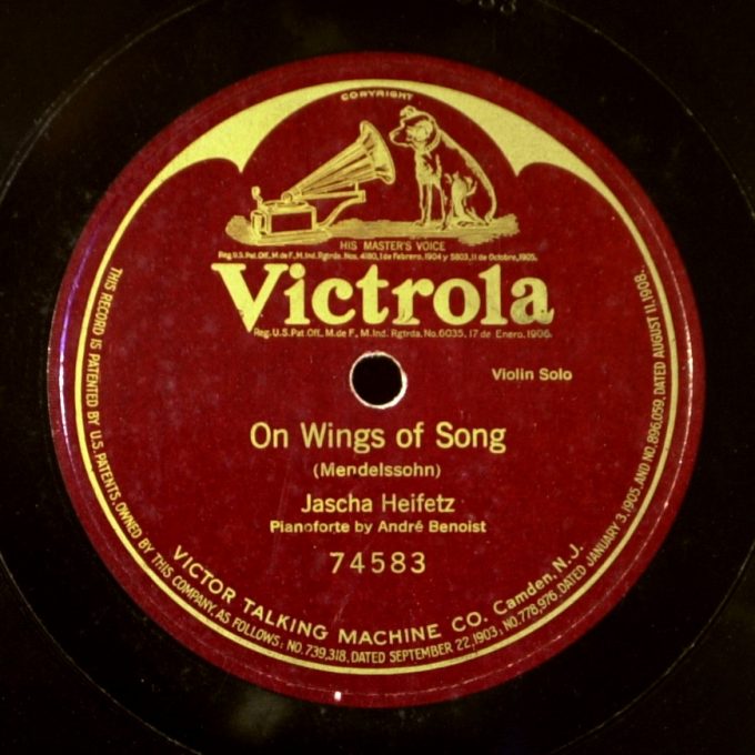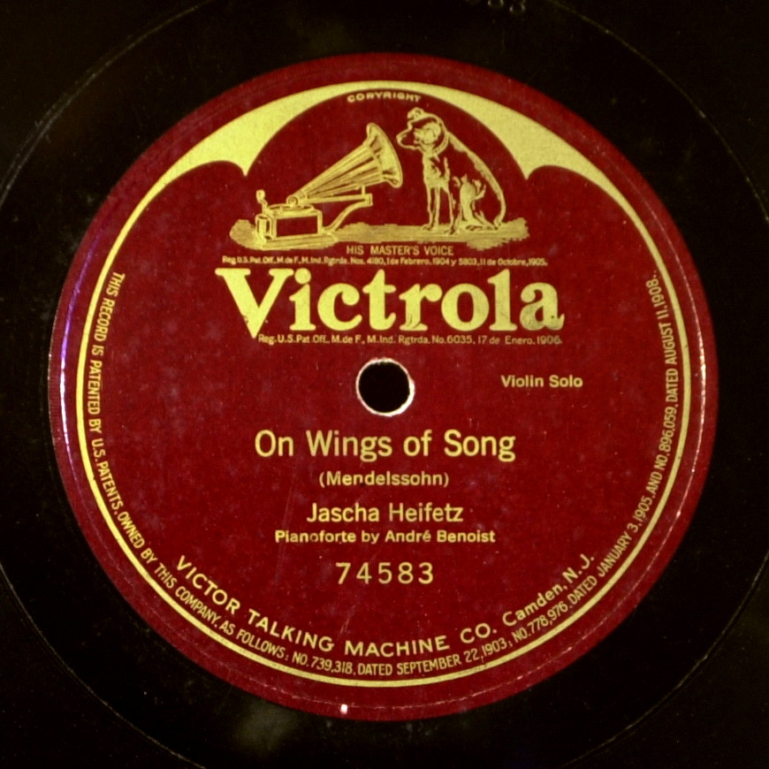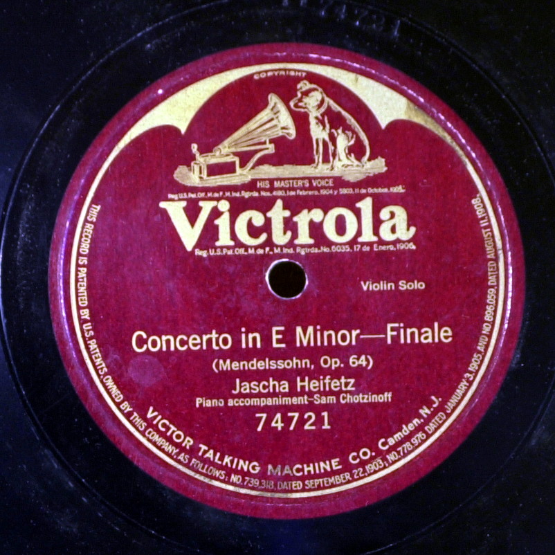 Jascha Heifetz Franz Schubert «Ave Maria», Piano acc. by Andre Benoist — 1917 Sarasate «Spanish Dance», op.21-1 — 1917 Sarasate «Introduction and Tarantelle», Op. 43 — 1918. Mendelssohn «On Wings of Song» — 1918 Bazzini «Les Ronde des Luntins» (Dance of the Goblins) — 1917 Wieniawski «Scherzo-Tarantelle» — 1917 Moszkowski «Guitarre» — 1918 Mendelssohn «Violin Concerto», Op. 64, in E Minor: Finale, piano: Samuel Chotzinoff — 1920