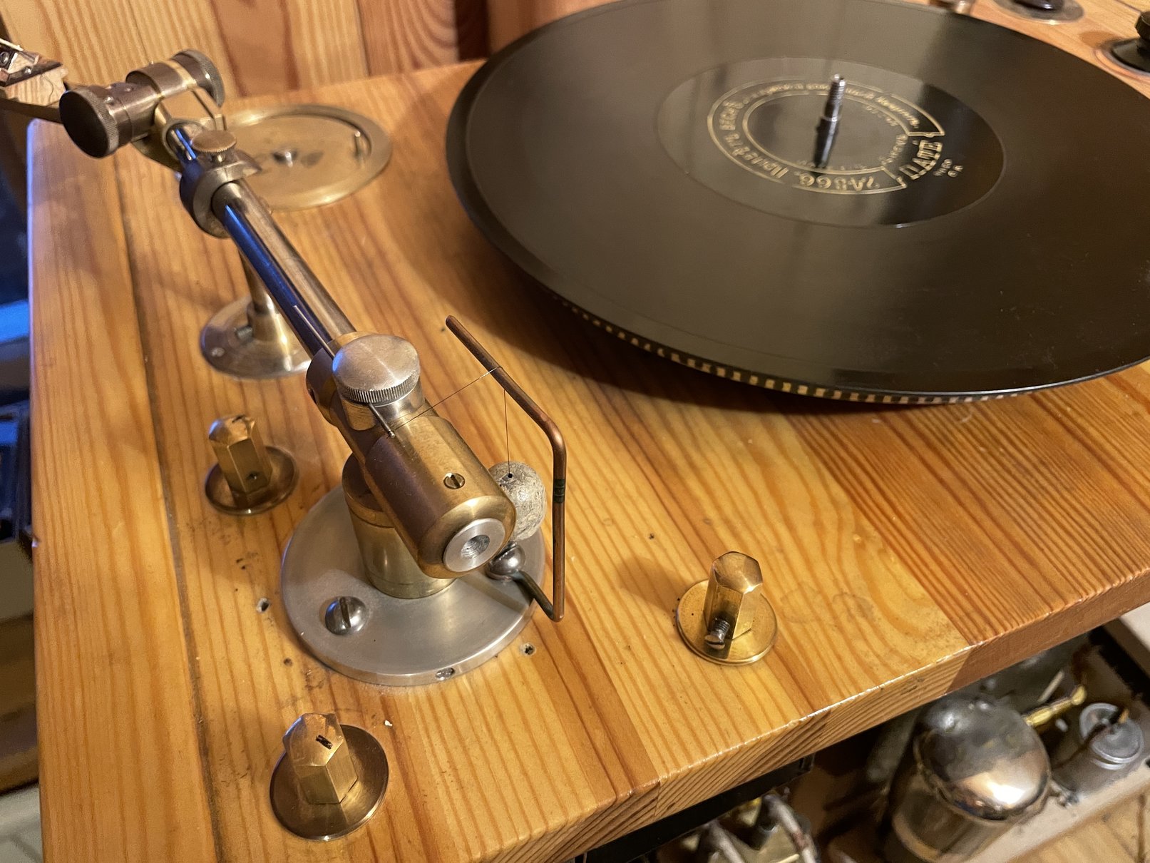 Как обычно, на практике приходится искать компромисс, как по прижиму, так и по диаметру иглы, с помощью подбора которой можно уйти из зоны износа канавки стандартной иголкой Pathe в случае, если таковой износ имеется. Для хорошо сохранившихся пластинок вполне подходит диаметр иглы 3-3.5 mil с прижимом 20-25 грамм. При этом, либо нужно использовать антискейт, либо устанавливать наклон проигрывателя так, чтобы тонарм под своим весом достаточно уверенно возвращался от центра к внешнему краю пластинки, иначе на коробленных пластинках игла все равно будет соскальзывать с дорожки в сторону центра. Для изношенных пластинок нужен больший диаметр иглы, вплоть до диаметра шарика от авторучки, как это делали любители еще в 20 веке.