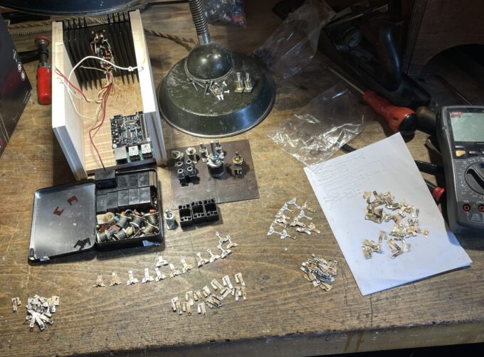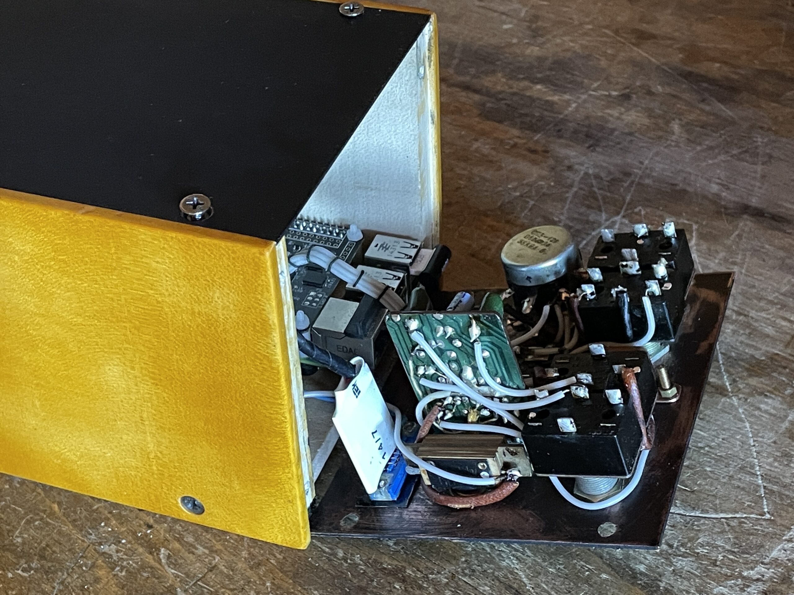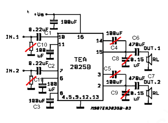Усилитель на TEA 2025 был взят от компьютерной колонки 1990х, коэффициент усиления схемы был снижен с помощью резисторов R11 и R12. Все лишние детали с платы были удалены, оставшиеся тщательно подобраны по звуку и направлению, плата подпилена и закреплена прямо на лицевой панели рядом с разъемами и переключателями с целью минимизировать количество соединительных проводов.