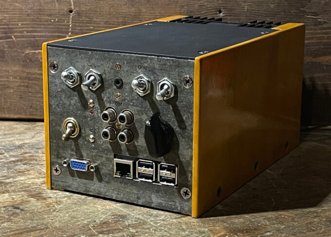Для удобства доступа к деталям корпус сделан полностью разборным, детали корпуса подобраны и состыкованы таким образом, чтобы расхождение их векторов в местах контакта с соседними элементами не превышало 90 градусов в каждой из трех проекций, все плоскости сориентированы «изнутри наружу». Боковые стенки и дно — из клена естественной сушки, покрыты шеллаком. Передняя и верхняя панели — из меди, вырезанной из какой-то старинной кастрюли, шурупы подобраны с направленностью изнутри-наружу.