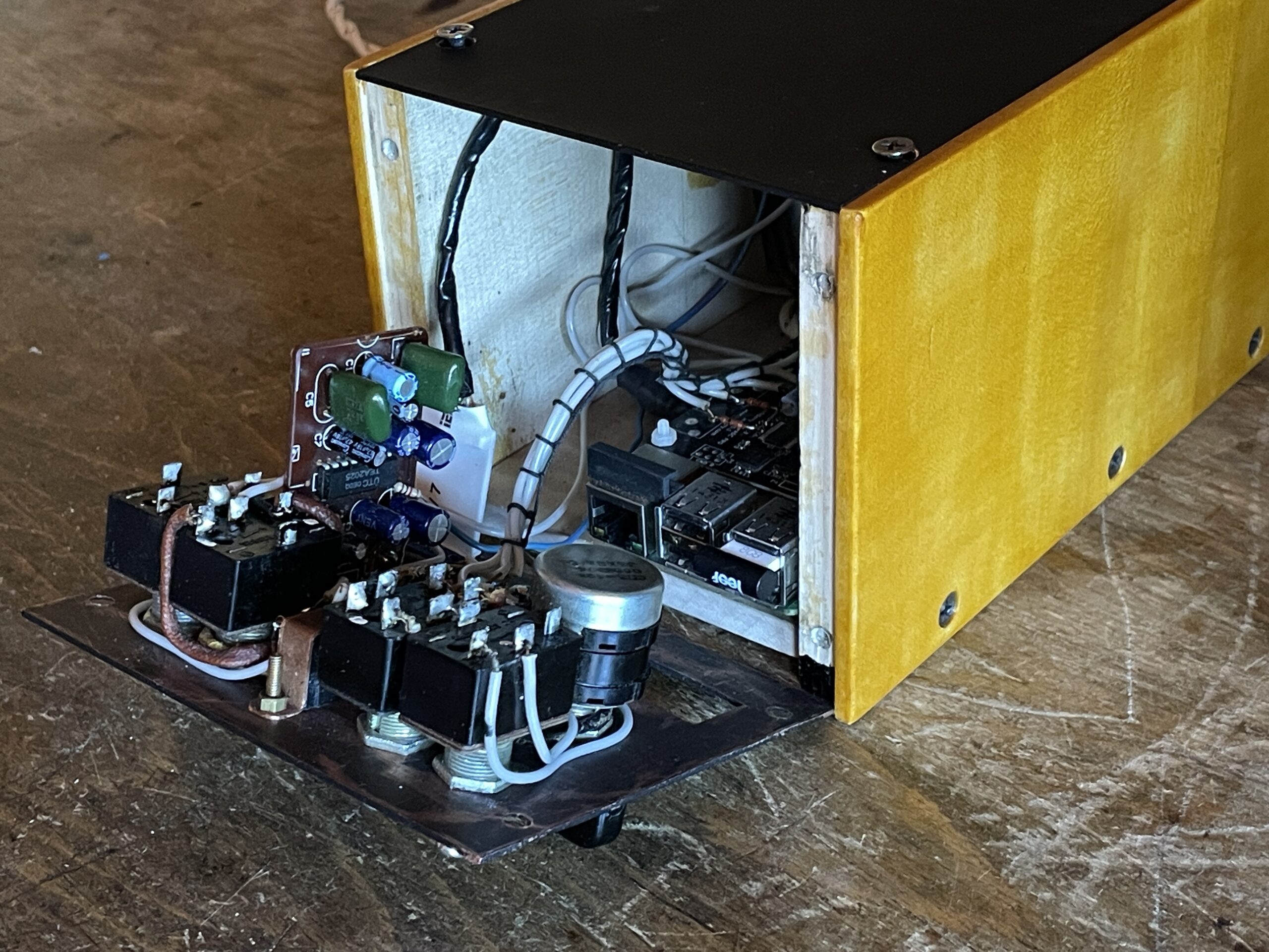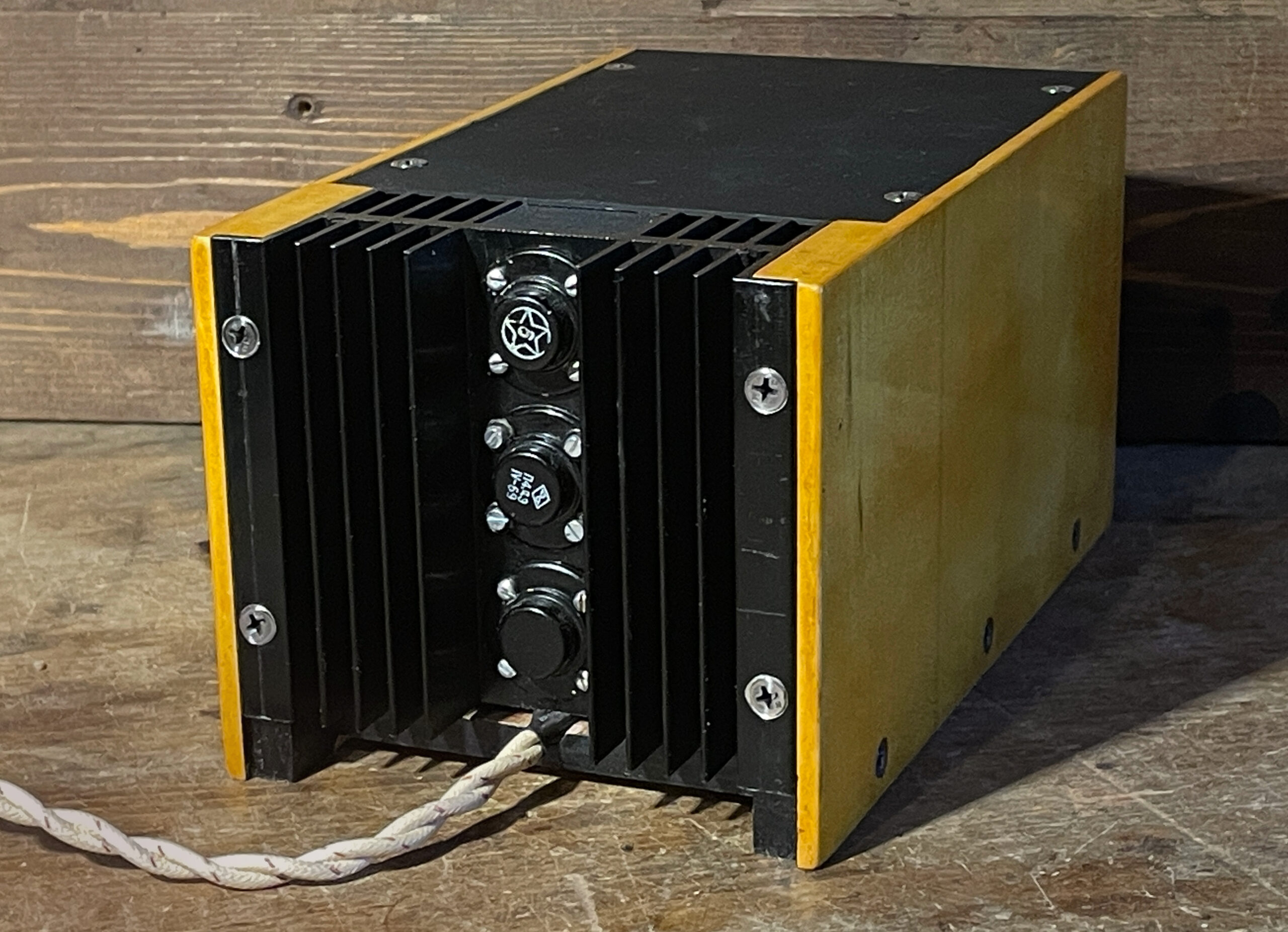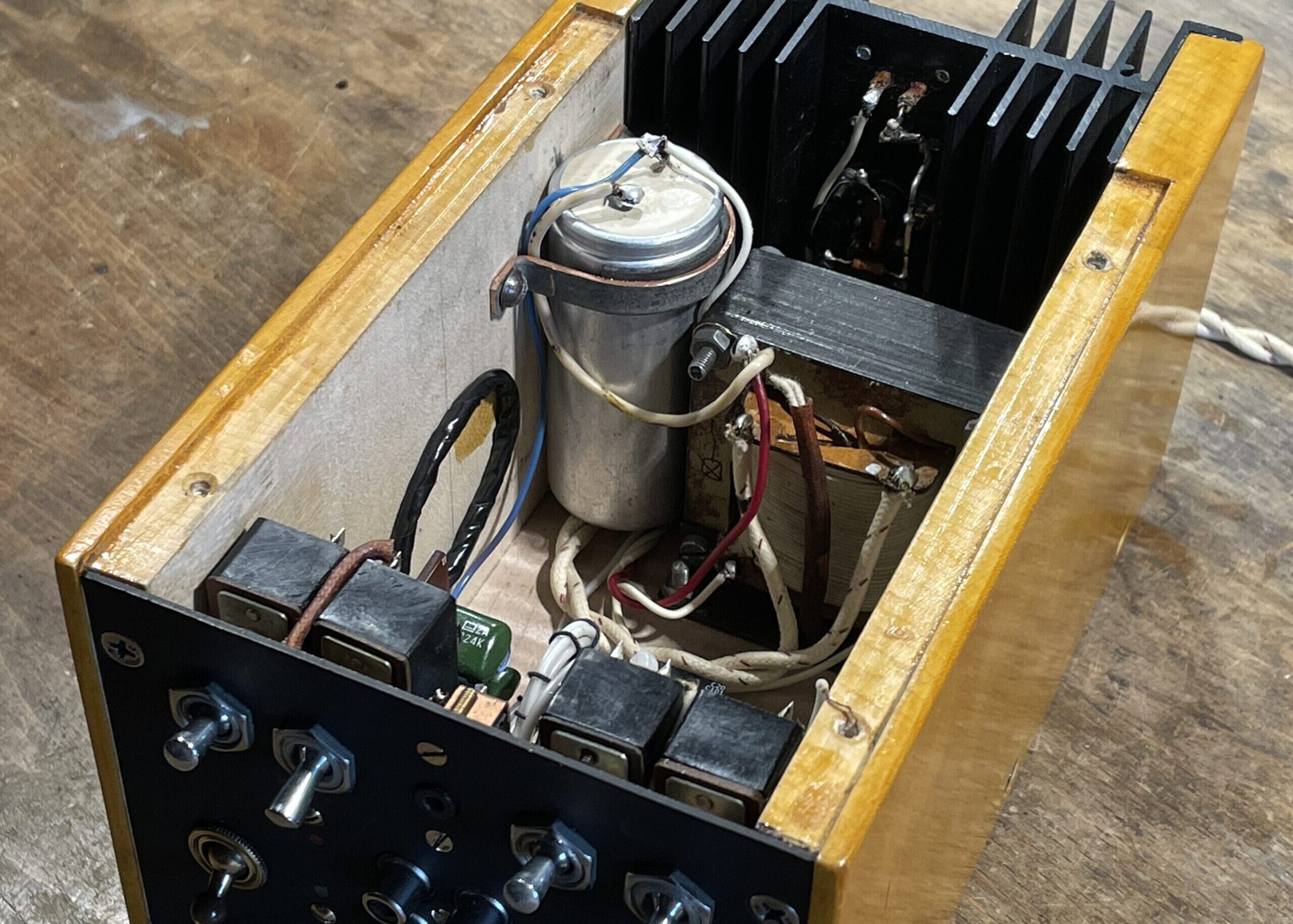 Трансформатор блока питания намотан на Ш железе 1930х, в обеих вторичных обмотках соблюдена направленность в ущерб правильному направлению намотки «по часовой стрелке» в одной из обмоток (наилучший вариант, который можно получить с броневым сердечником см. Симметричный трансформатор). Использовано двухполупериодное выпрямление (мост звучит хуже из-за двух дополнительных диодов). Функцию выпрямителей выполняют ранние германиевые P-N-P транзисторы П4 с правильно направленными медными основаниями и шляпками.