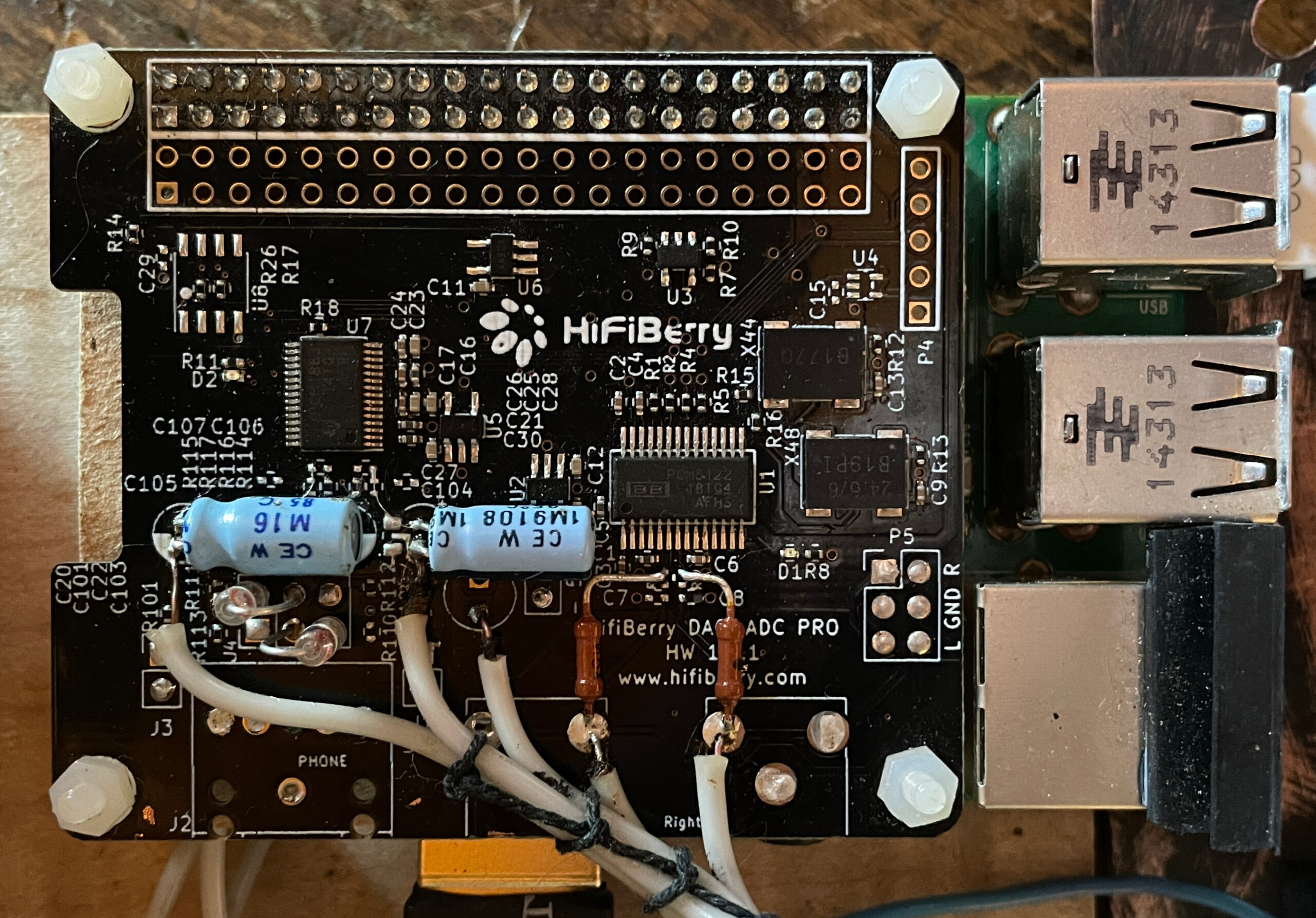 В АЦП HiFiBerry заменены разделительные конденсаторы и установлены стабилитроны защиты входов от возможного кратковременного перенапряжения, возникающего в выходном каскаде лампового корректора. На выходе ЦАП конденсаторы ФНЧ заменены на электролиты 1970х, подобранные с направлением от плюса к минусу. Так-же заменены резисторы 470 Ом, включенные последовательно с выходом АЦП. Исключить их не получилось — в случае высокой емкостной нагрузки (например, длинный соединительный кабель) без этих резисторов микросхема начинала шуметь. На замену установлены советские резисторы 1970х у которых все четыре элемента (корпус, резистивное покрытие и оба вывода) были направлены в одну сторону.
