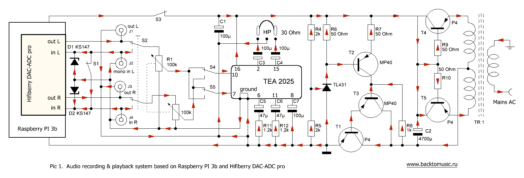 В отличие от Mac G3, при закорачивании входов Hifiberri принципиальных потерь ясности не возникает (более удачные по направлениям выводы и внутренняя разводка входов микросхемы АЦП), выключатель S1 позволяет записывать моно сигнал на оба стерео канала — в некоторых ситуациях такой вариант оказывается предпочтительным по звуку. Входной моно сигнал при этом подается на разъем J2.