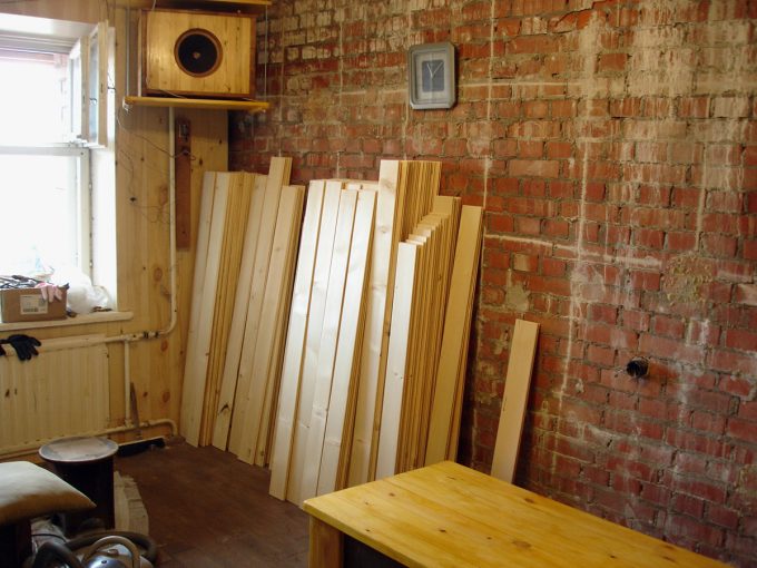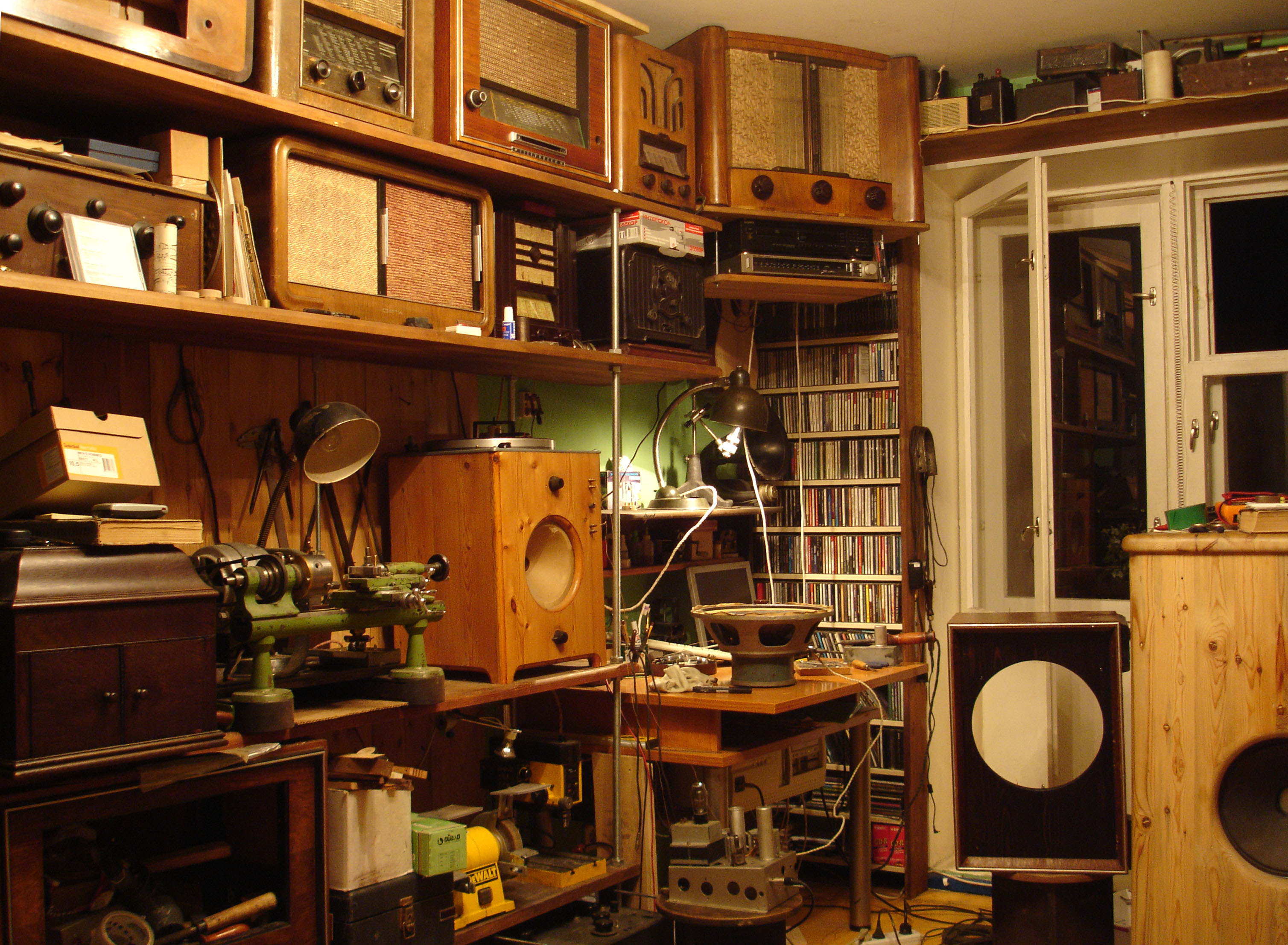 По уму, сначала нужно было освободить комнату до голых стен и начинать работу с нуля, но вывозить барахло было некуда и все началось с замены предметов обстановки из ДСП и пластика на деревянные. Где-то за год все полки, стеллажи и даже кровать в комнате были переделаны с использованием покупного, деревянного массива, в комнате так-же зажили с десяток довоенных приемников, патефон и коллекция из пяти тысяч пластинок, половина из которых была шеллачной. По ходу дела исследовались варианты расположения предметов в комнате, мебель переставлялась так и эдак, тем не менее, результат был неудовлетворительным — дерево вносило свои положительные коррективы в Окраску звучания комнаты, но тракт, так же, как и раньше, играл без нареканий только в ближнем поле, стоило отойти от него на пару метров и музыка распадалась, тембры нищали и грубели. Рядом с массивными предметами звучание непредсказуемо менялось: где-то музыка раскрывалась, в другом месте теряла силу. В итоге пришлось признать, что манипуляции с мебелью из стандартных, деревянных щитов не эффективны, нужна другая обстановка, имеющая равномерную ауру, такая, чтобы с помощью ее ориентации можно было заставить комнату чисто «петь» в необходимую сторону. Соответственно, обозначился следующий этап аудио-апгрейда — стеллажи и полки предстояло разобрать, распилить на рейки и переклеить их Сонаправленно. Работа выглядела слишком сложной и я еще долго не мог за нее взяться, занимаясь решением задач попроще.