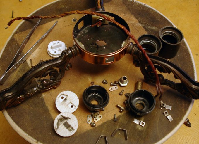 Позже я попытался решить проблему, вооружившись знаниями о Векторной Направленности проводников и диэлектриков, разобрал люстру до винтиков и выбрал подходящие по Направленности детали, которых хватило как раз на три рожка. Три — так три, люстра была собрана и на сей раз я почувствовал выраженный, положительный результат. Однако, еще через пару лет из-за очередного, возрастного ужесточения требований к звучанию, ситуация «под люстрой» проявилась в том-же ключе, что и раньше. Я исправил несколько ошибок, допущенных при предыдущем апгрейде, поигрался с разными типами ламп, фазами и подводкой электричества — безрезультатно, отрицательное влияние включенной люстры оставалось неприемлемым и люстра была вынесена на помойку. Ее место занял дореволюционный, керамический патрон в латунной окантовке, при этом, сразу полегчало, но отрицательные моменты при включении света полностью не исчезли и пришлось снова вернуться к настольным лампам на стеллажах вдоль стен. Причиной проблемы, в итоге, оказалась бетонная плита потолочного перекрытия, уложенная при постройке «вверх ногами». Отрицательное влияние неверно сориентированной, железобетонной плиты на провода, проложенные в ее внутренностях и на ввинченный в нее крюк (прекрасный, самодельный крюк из старого, кованного железа между прочим) оказалось неискоренимым.