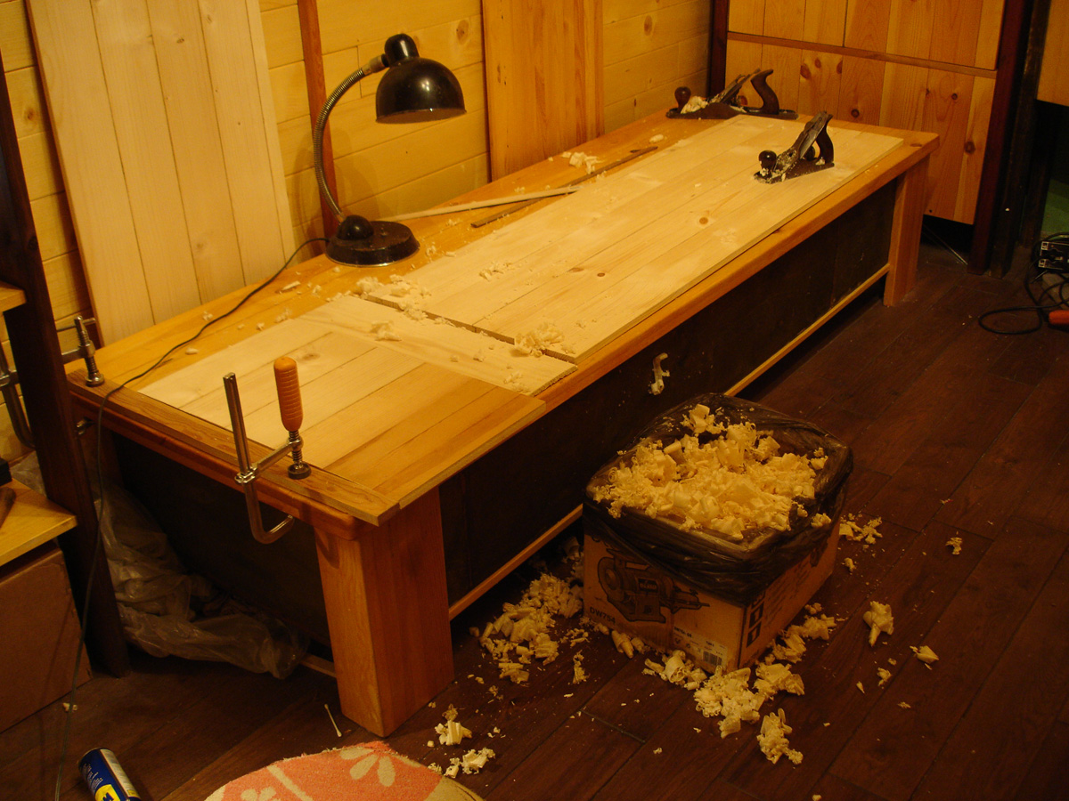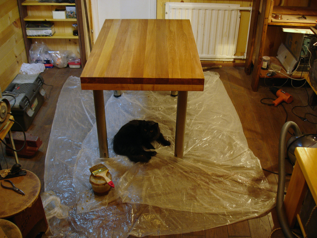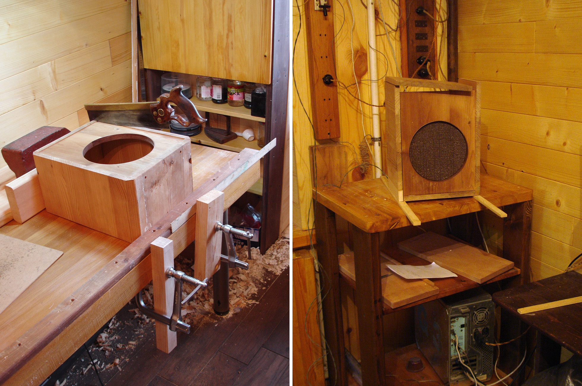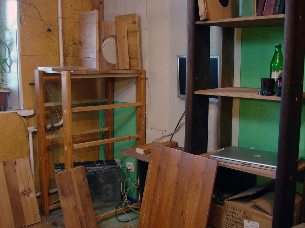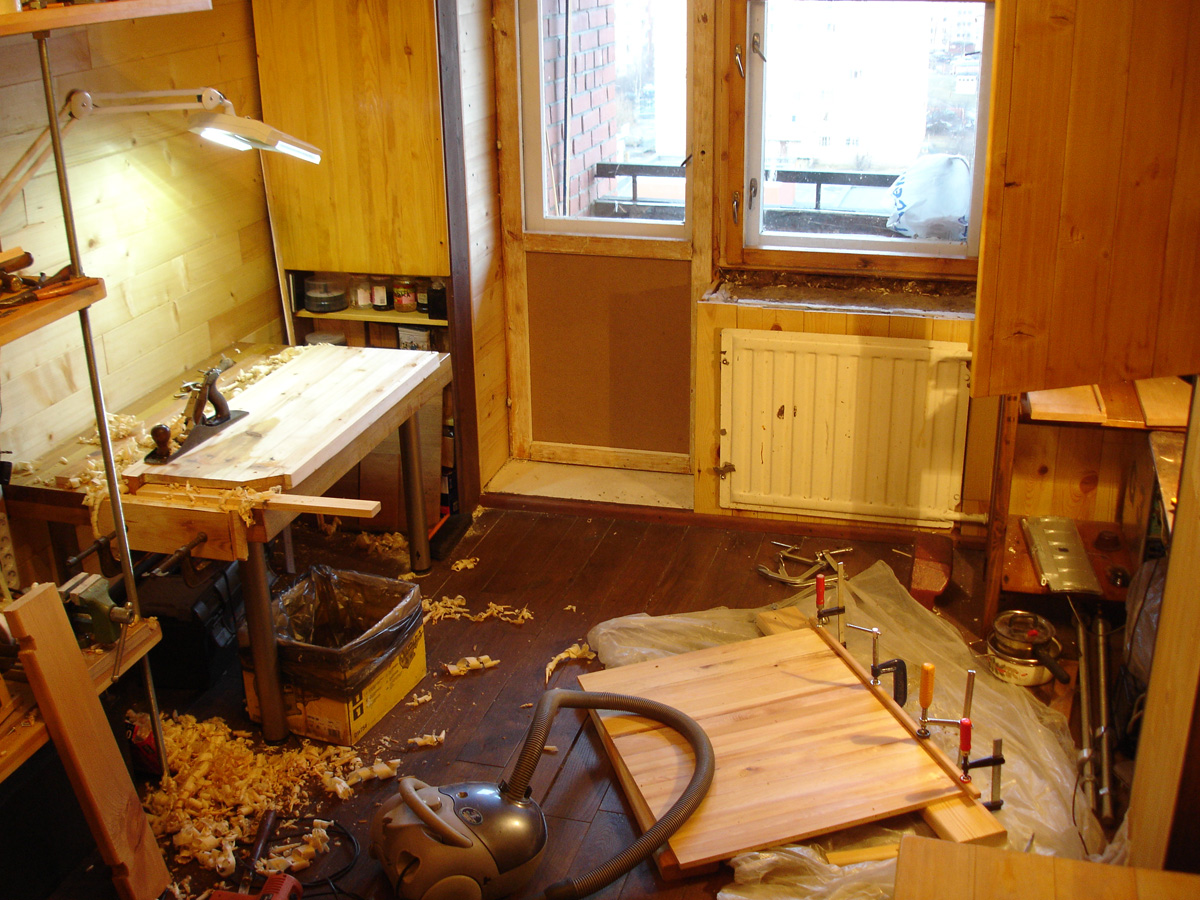 Большинство мебели в комнате — полки, стеллажи, дверцы шкафов и даже кровать были собраны из покупного массива. Все это дело предстояло разобрать, распилить по швам, рассортировать полученные рейки по размерам и распилу (тангенс, радиал, правый и левый косослой), определить их Направленность и склеить их так, чтобы новые щиты представляли собой «единое, тонкое целое» с естественно выраженной Направленностью в необходимую сторону. Работа делалась вручную, отсутствие свободного места в комнате вызывало массу неудобств и на переделку щитов у меня ушло несколько месяцев практически без перерывов. Рутина меня откровенно достала, я стал делать какие-то, совсем уж глупые ошибки, нужно было взять паузу, но мысль созрела слишком поздно. Одна из ошибок стала фатальной для Тестового Аудиотракта, свалившегося с верхней, угловой полки, когда я пытался организовать там подобие Энергетического Рупора для упрощения тестов. По ходу дела я несколько раз менял ориентацию несущих шпилек и их крепежа, кончилось все тем, что после очередной разборки-сборки я не расклинил один из дюбелей и он через какое-то время выскочил из отверстия. Аккурат в четыре часа ночи, на радость мне, обезумевшему коту и соседям снизу все хозяйство неожиданно грохнулось сначала на край стола, потом со смаком и хрустом перевалилось через край и размазалось по полу. Хорошо, что не на голову.