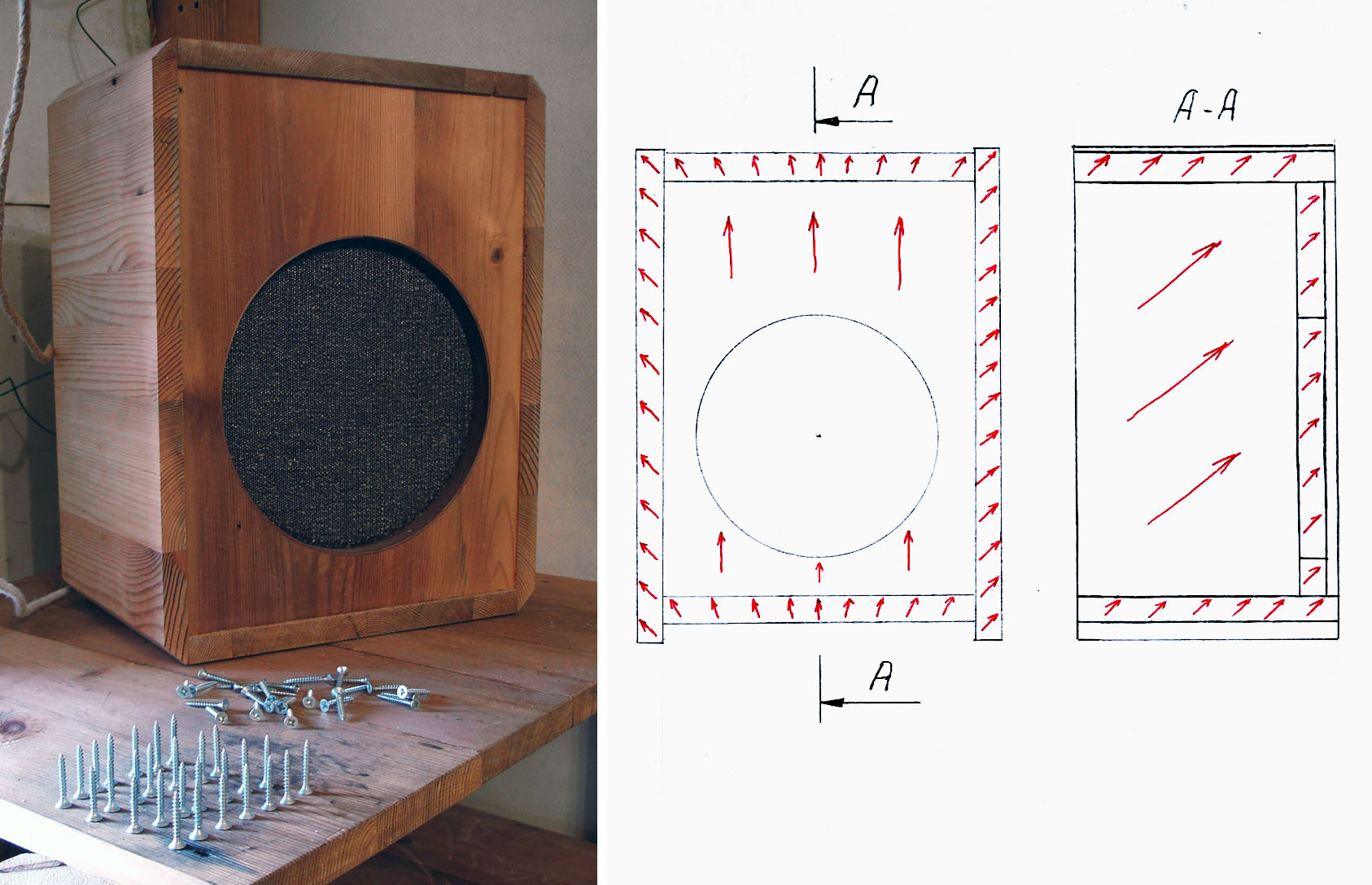 Лишившись Тестового Аудиотракта (ТА), я был вынужден отвлечься на сборку специальной, тестовой АС. Корпус ТА был собран когда-то по схеме «снаружи-внутрь», которая была навеяна рисунком магнитных линий трансформатора. Были и более веские причины, подтверждающие красивую, трансформаторную версию: первое — неоднократно проверенная предпочтительная Направленность стола стойки под аппаратуру «снизу-вверх» согласовывалась с Направленностью днища ТА «снизу-вверх» и второе — корзина громкоговорителя, использованного в ТА имела направленность снаружи-внутрь (сейчас я знаю, что это не правильно, а тогда не знал), соответственно, во время предварительных примерок этот громкоговоритель звучал привлекательней, если прислоненная к нему передняя панель АС имела такое-же Направление «снаружи-внутрь». В итоге получилась неоптимальная схема корпуса ТА со специфическим звучанием, которая впоследствии, в определенных условиях, точнее, при отсутствии этих условий, затрудняла выбор правильного направления. Новая колонка была собрана по другой схеме, которая по факту тоже оказалась неоптимальной, АС пришлось распиливать по швам и переклеивать новый вариант, однако и второй вариант был тоже впоследствии забракован. Тем не менее, второй вариант тестовой АС (см. рис) уже давал лучший, чем ТА ориентир для тестов и в итоге хорошо послужил своему делу. От следующего варианта схемы — АДАС он, по большому счету, отличался только Направленностью днища и всего, что на этом днище было установлено внутри колонки.