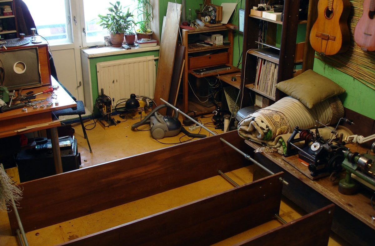 С точки зрения Тонкой Акустики, наихудший вариант городского помещения — это комната в новодельной многоэтажке с пресловутым евроремонтом. Ни о каких особых музыкальных тонкостях тут говорить не приходится, перспектив приблизиться к звучанию старого фонда в такой комнате нет. По иронии судьбы, именно такой вариант достался мне — новостройка 1990х годов с тяжелой, унылой энергетикой. Комната используется, как мастерская, кладовка и даже, как спальня; акустически, она так-же не представляет никакой ценности, все пространство вдоль стен от пола до потолка заставлено стеллажами и полками с инструментами, пластинками, приемниками и аудио оборудованием. Размеры 2.9 на 4.6, потолок 2.5 метра, из положительного — мягкий резонанс в районе 40 Гц (продольный размер комнаты, смягченный оконным проемом), все остальное — отрицательное, особенно достают добротные всплески на 60, 75 и гул на 130(+/-15)Гц. Но тем интересней было попробовать сделать из комнаты что-то аудиофильски-приемлемое, используя только тонкие методы воздействия на ее звучание.
