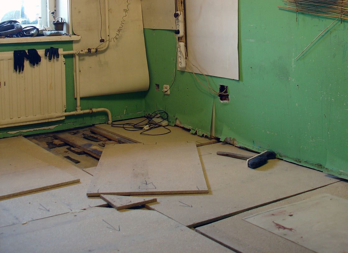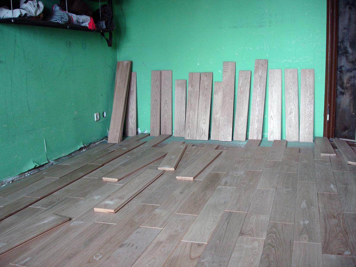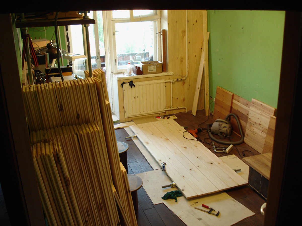 Изначально в комнате на бетонный пол были уложены деревянные лаги на подкладках, сверху ДСП, затем линолеум. Пол пришлось полностью разбирать, определять Направленность подкладок, лаг и ДСП, затем укладывать их в Направлении «снизу-вверх, от АС к слушателю». Часть ДСП при этом надо было перевернуть и/или прокрутить, в итоге листы пришлось перекраивать и складывать черный пол с нуля. С чистовым полом все оказалось еще сложнее: изрядно походив по магазинам и пощупав паркет и доски, я так и не смог ничего выбрать, дерево было откровенным г, распил досок в пакетах хаотичный, а мне нужен был только тангенс. С огромным трудом удалось найти контору, где можно было наскоро выбрать дубовую, шпунтованную доску, купить ее с запасом, спокойно протестировать дома, а затем вернуть неподходящую часть. После того, как прямо в комнате доски были отобраны и сложены в одинаковом продольном направлении лицом кверху, обозначилась еще одна проблема: примерно у половины досок выступ шпунта оказался в одну сторону, а у оставшейся части — в другую. Казалось бы, ничего страшного, надо дополнительно сделать деревянную планку-шип и с помощью нее склеить проходящие по центру комнаты пары досок «мама к маме». Из комнаты были вывезены необходимые инструменты, я заказал планку в конторе, где к тому времени уже вел переговоры по доскам для стен, мне пообещали ее сделать «не сегодня, так завтра» и продинамили. Пришлось по ходу укладки пола второпях вклеивать какие-то вставочки, выструганные на коленях, все бы было ничего, но паркет оказался сырой (божились, что высушен как для мебели). После отопительного сезона доски усохли, хилый шов в центре разошелся, выдрав все мои вставочки и я в итоге стал счастливым обладателем аудиофильского пола с щелью посреди комнаты, хоть опять выноси мебель и перекладывай заново. Но, не в пример внешнему виду, функцию «тонкого экрана» пол выполнял хорошо и я решил его не трогать, ибо нефик.