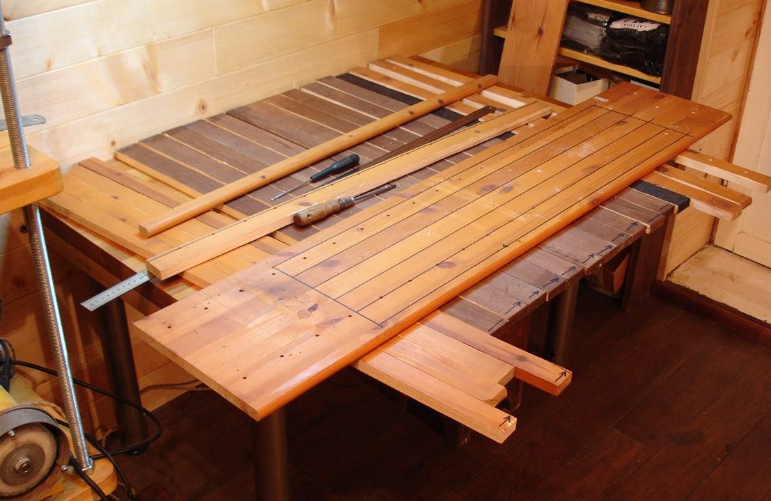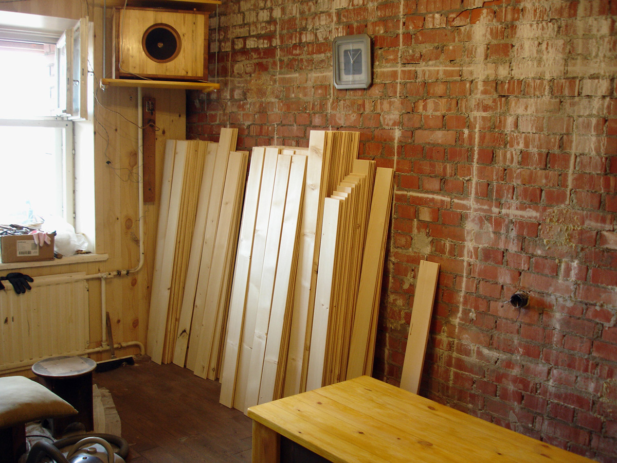 Реализация идеи, как обычно, превратилась в одну, большую проблему: выяснилось, что стройматериалы, в отличие от музыкальной древесины, никто не пилит под определенный распил, более того, из всех «мастеров» по деревозаготовке и деревообработке, с которыми мне довелось столкнуться, никто уверенно не знал, что это такое — распил и с чем его пьют. Понятно, когда приходится объяснять людям не связанные с их профессией моменты — например, необходимость сверяться с метками Направленности на казалось-бы симметричных заготовках, но тут еще на вполне объективном этапе я уперся в стену непонимания и нежелания ничего понимать — даже с подробными объяснениями и рисунками народ гнал лажу, а когда я об этом говорил, смотрел на меня, как на больного. Ладно, с большим трудом, но доску я в итоге получил. Дерево, как сейчас принято, — полусырое и обработанное твердосплавными инструментами, оказалось по звуку разве что лучше ДСП. Проблемы были и с точностью распила, в первую очередь это касалось радиальных досок, которые можно сделать только из толстых стволов по заморочистой схеме раскроя бревна, редко используемой для строительных целей. Здесь мне пришлось в основном выбирать не то, что нужно, а то, что хоть как-то подойдет и, несмотря на то, что по количеству был взят запас 50%, чистого радиала после всех отбраковок набралось только четверть от необходимого, остальное оказалось так или иначе скошенным. Вдобавок ко всему, доски мне пилили в два приема и умудрились сделать это так, что шпунты из первой партии не стыковались со второй. На складывание стен, в итоге, я потратил больше недели, звучание, правда, стало радовать уже на промежуточной стадии и я не особо расстраивался.
