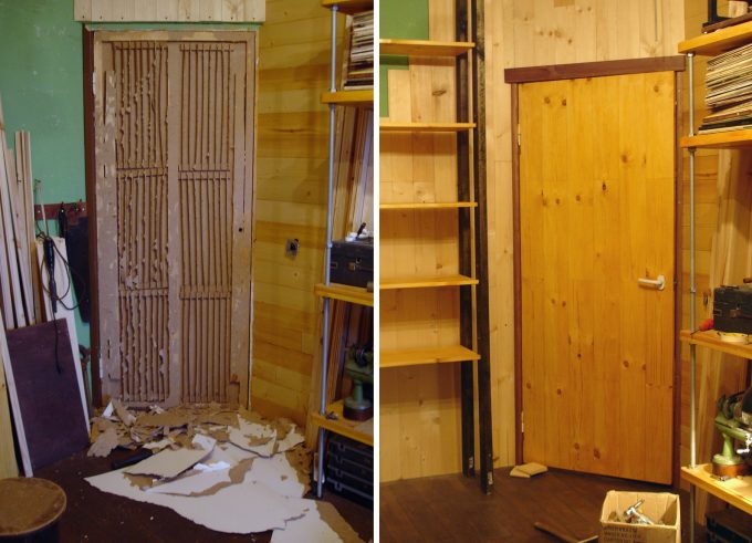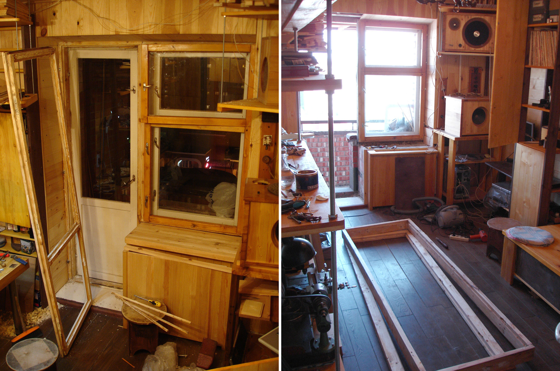 Оконный проем и балконная дверь были сделаны из дерева, и дерева неплохого, но с Направленностью там, естественно, царил бардак и само-собой напрашивалось решение о полной замене окна и проема. От одной мысли, что мне опять придется общаться с профессионалами деревообработки у меня пропадало желание что-либо делать, поэтому я решил просто вытащить максимум из того, что есть: ободрал краску, удалил гипрок из оконного проема, разобрал на части двери и окна. Задачей было собрать все так, чтобы соблюсти хотя-бы вертикальную составляющую Направленности проема «снизу-вверх», точная, Векторная Ориентация в данном случае была невозможна. Правильно собрать удалось дверные коробки, одну, внутреннюю дверь и два окна, остальное было с ошибками, хоть и меньшими, чем изначально. Все новые детали — деревянная обшивка ниши, щит, закрывающий батарею, планки, заменяющие оргалит в нижней части балконных дверей и штапики были сделаны, как положено. Комплект нормальных петель, замков и ручек удалось собрать из других комнат.