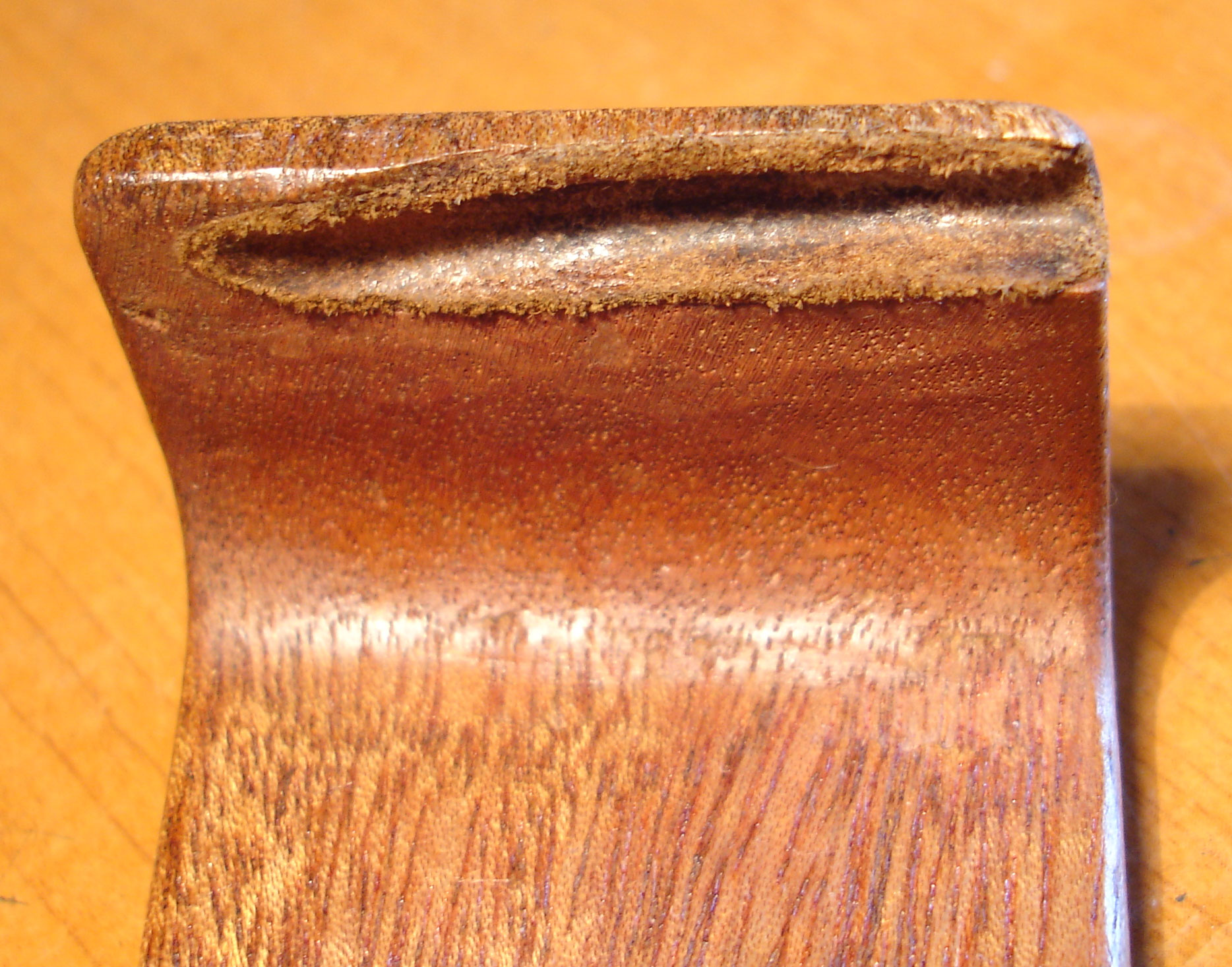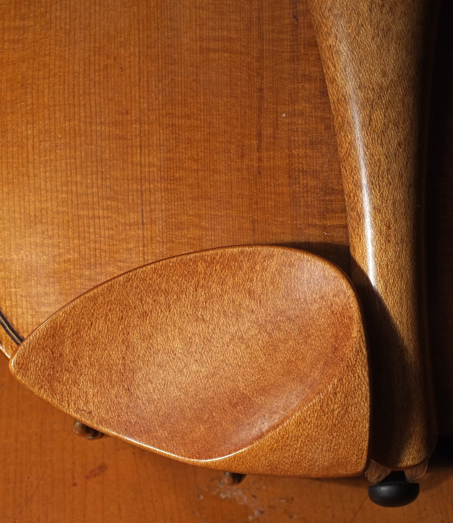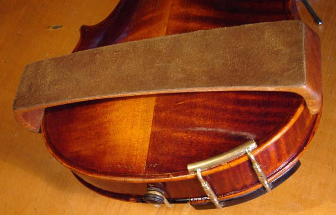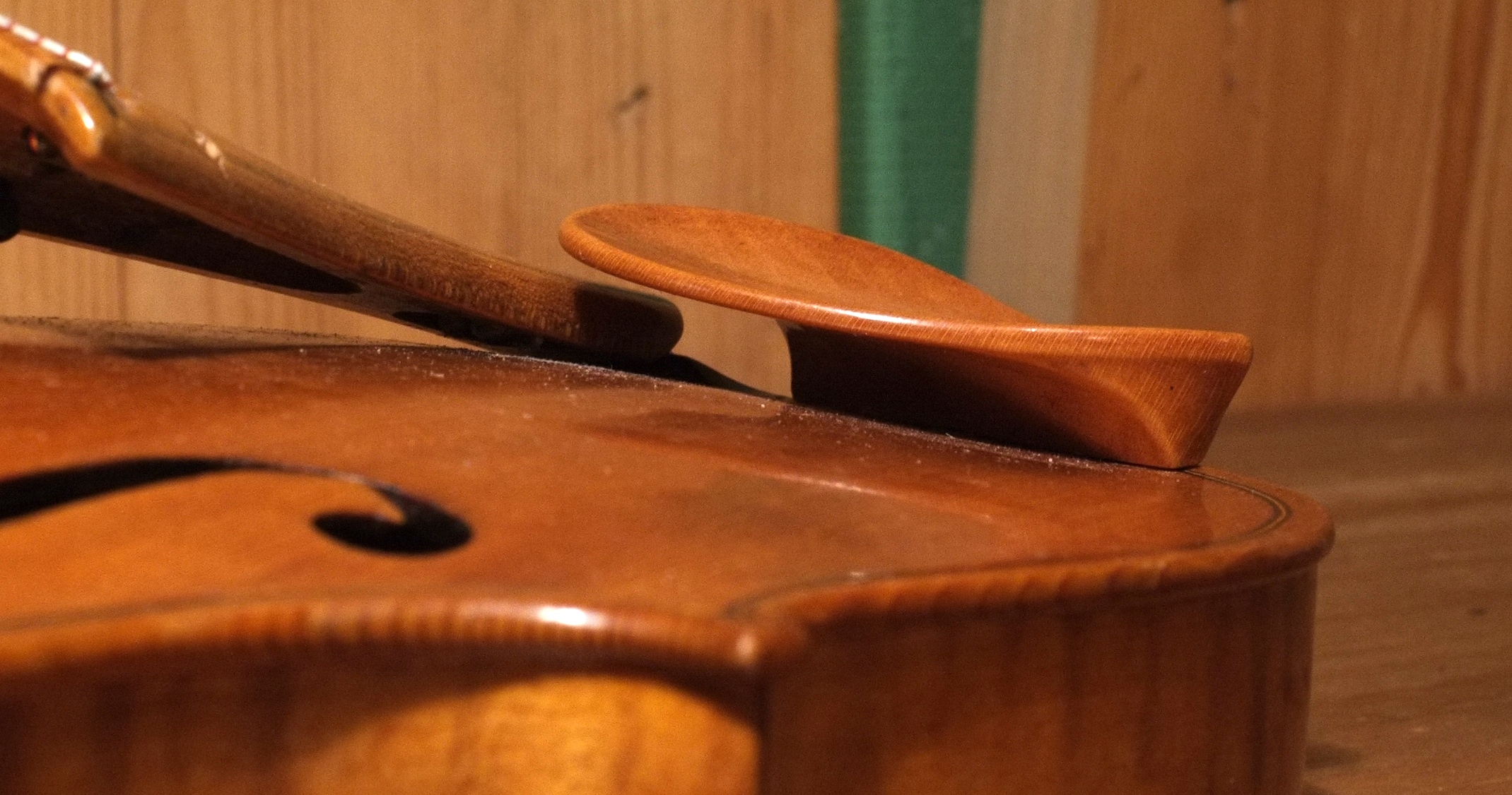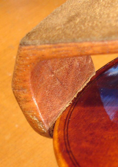 Подбородник так-же сделан из белого клена из-за отсутствия хорошего, черного дерева. Распил подбородника тангенциальный, не такой красивый, как у колковых головок. Выбор распила обусловлен менее выразительным звучанием радиального распиленного подбородника, что было выявлено во время тестирования соответствующих заготовок. Бейц так-же отличается — здесь опробована смесь черемухи и алоэ.