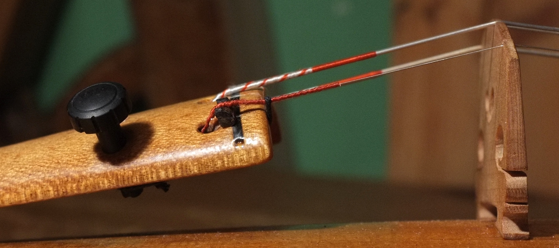 В первой версии (фото 4) регулировочные винты, для минимизации веса, были сделаны с маленькой головкой, однако, оказалось, что такие винты трудно крутить с натянутыми струнами. Во второй версии была увеличена высота головок, крутить винты все равно оказалось затруднительно. В третьей версии (фото 5 и 6) был максимально увеличен диаметр головок без увеличения их высоты, что решило, наконец, проблему, но, как оказалось, только для меня, а не для дочки, которой предназначался инструмент.