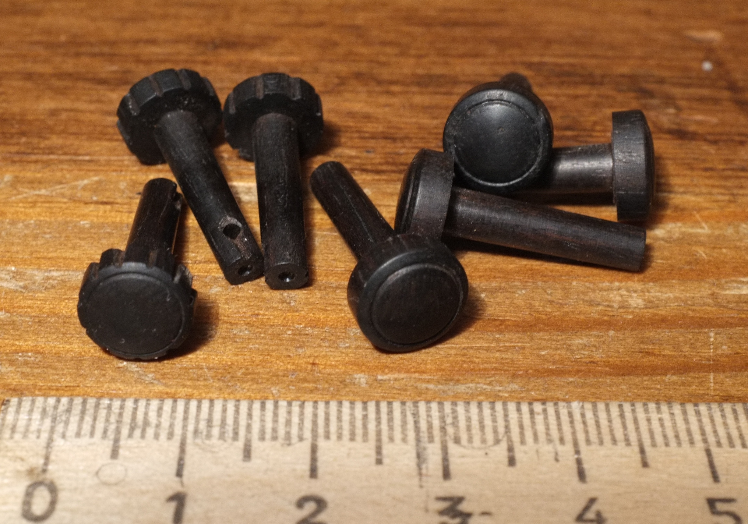 Рабочая поверхность колков сделана из черного дерева, головка — из обычного, белого клена, покрытого экстрактом коры черемухи и масляным лаком. Струна наматывается на участок древка колка, проточенный до диаметра 5мм, такое решение позволяет без дополнительной системы микронастройки, ухудшающей звучание скрипки, настраивать струны точнее, чем стандартным колком с диаметром ~ 7 мм. Колки сделаны из разных пород дерева из-за отсутсвия подходящих, хорошо звучащих заготовок черного дерева (древко колков выточено из клавиш от рояля середины 19 века), однако их внешний вид и музыкальные свойства оказались вполне приемлемы.