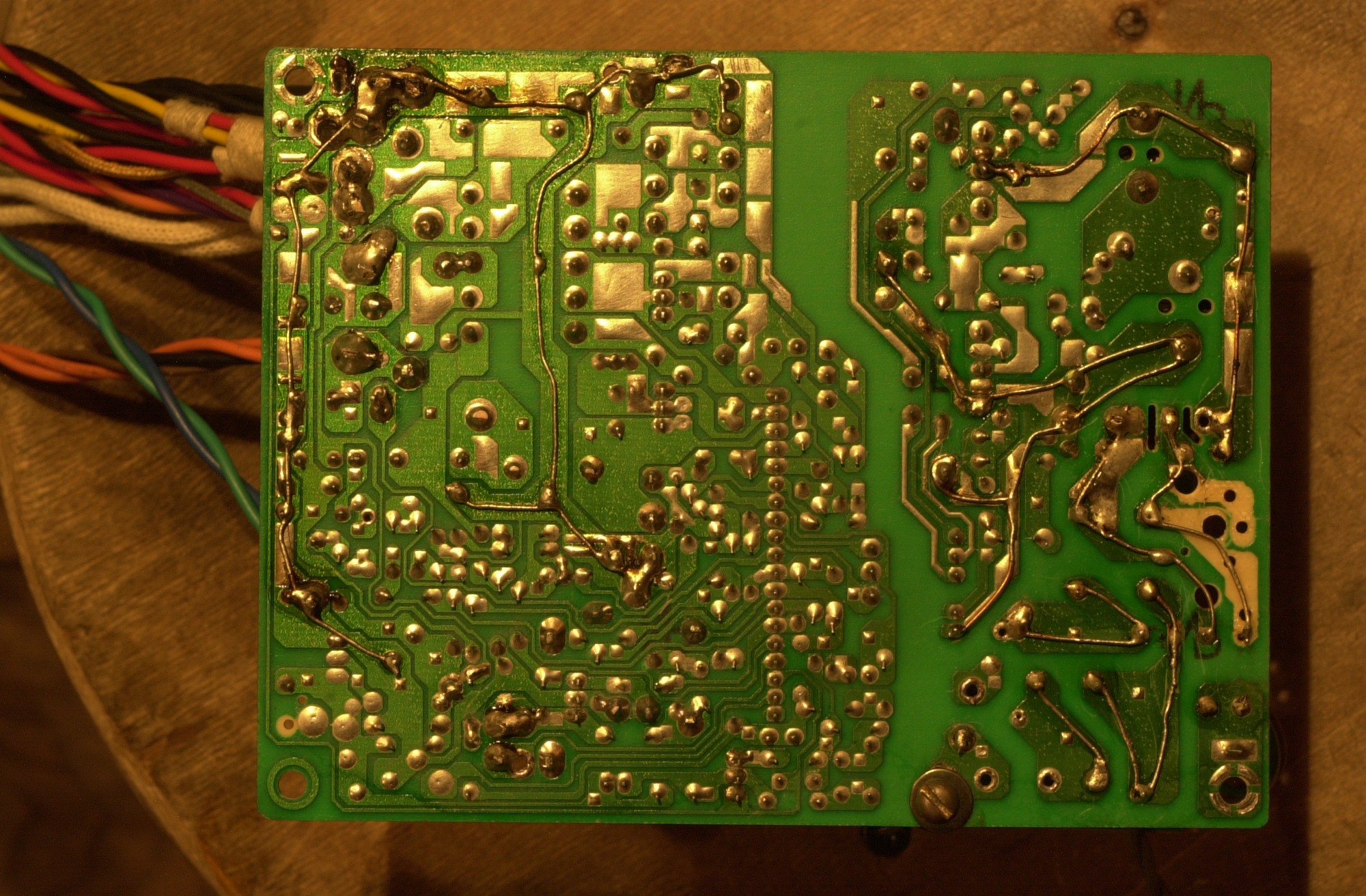 В таком виде компьютер играл очень прилично, но оставались проблемы с надежностью хранения информации — старые винчестеры сыпались, а новые нельзя было поставить на старый контроллер, как из-за отсутствия драйверов, так и по причине ухудшения звучания. Наладить запись СД под ДОС мне не удалось и от этой идеи пришлось отказаться, но главной проблемой, с которой я столкнулся были глюки софта и драйверов, некоторые из которых остались не побежденными. Я думал, что решу эти проблемы позже с помощью профи и со своей, эзотерической стороны дела довел комп до рабочего, «играбельного» состояния, не пожалел времени на экстремальное упрощение конструкции, «улучшайзинг» с помощью наклеивания старой меди на микросхемы, дублирования дорожек старыми проводами, проводке параллельных земель по Контурам итд. Несмотря на глюки, в компе даже была сделана запись прямо под голым ДОС 5.0 (!), но специалиста по старому программному обеспечению в итоге так и не нашлось, комп несколько лет пропылился без дела и в конце концов был разобран на запчасти.