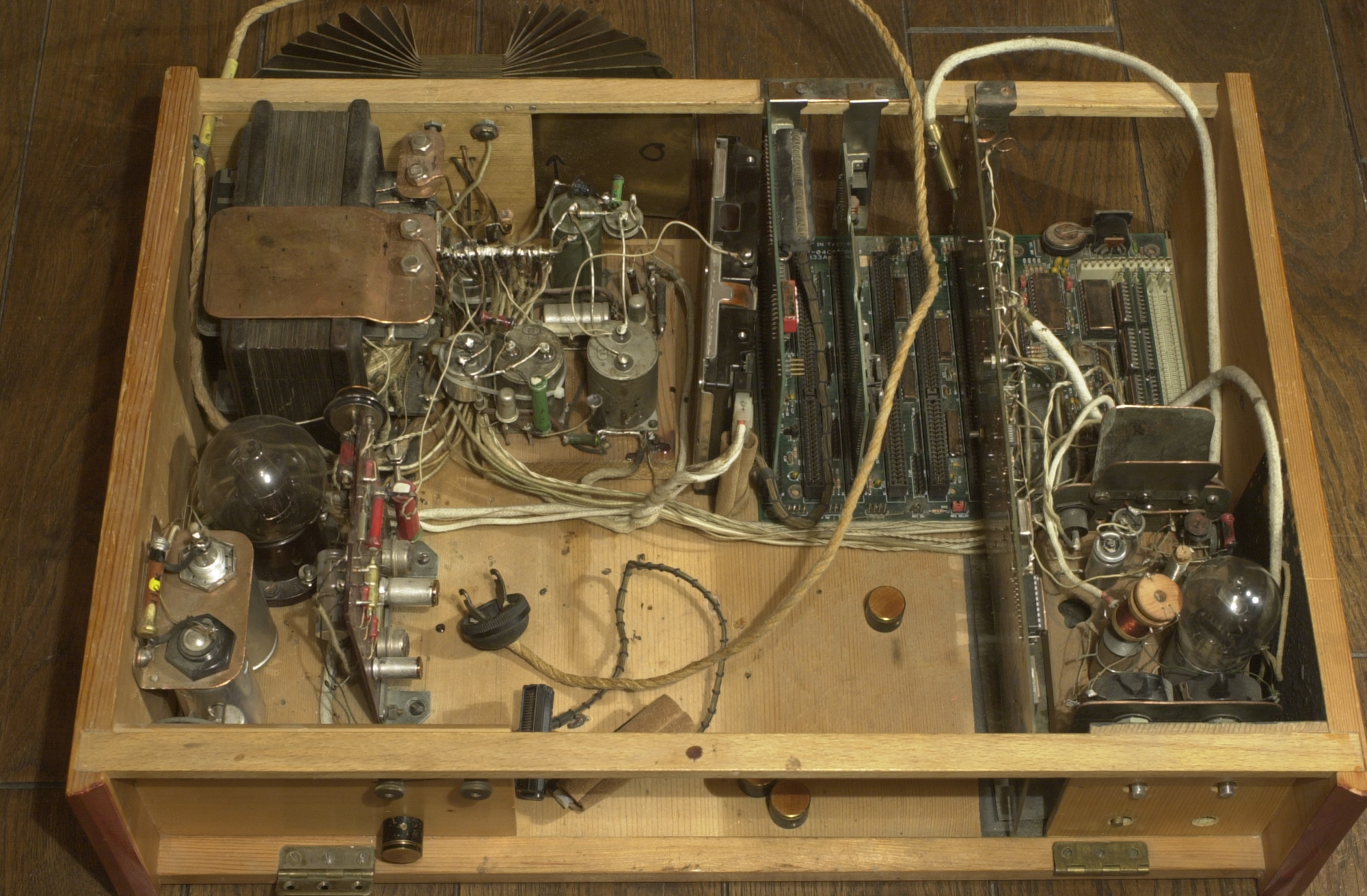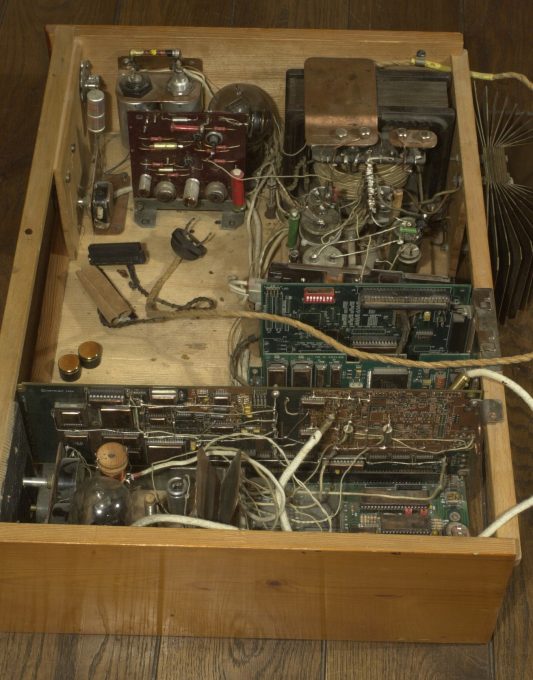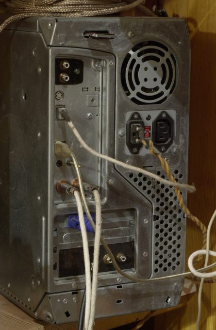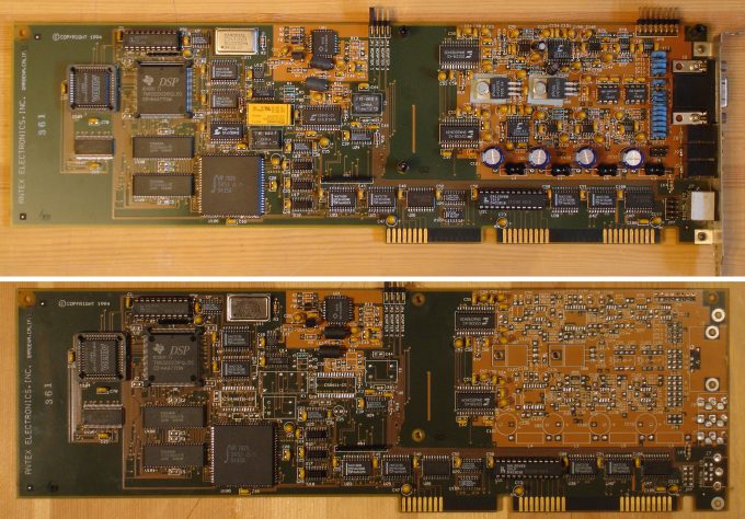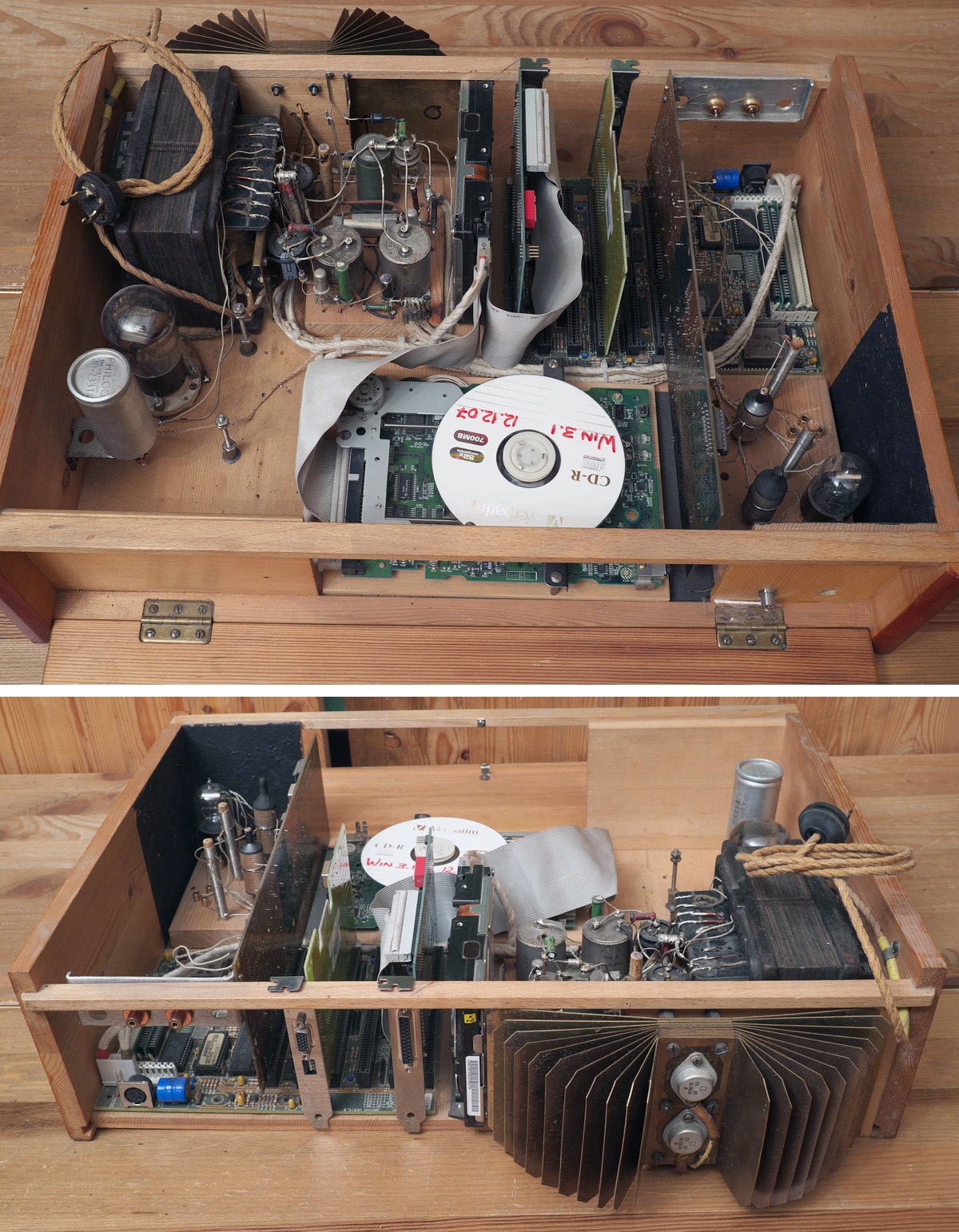 За пару лет интенсивных поисков было собрано большое количество старого, компьютерного барахла, — материнские платы от PC-286 до пентиумов, источники питания, ISA видео и звуковые карты, SCSI контроллеры для подключения ранних СД и винчестеров (старые материнские платы не поддерживают IDE винты больше 50-100 мБ, или поддерживает с большими глюками, первые СД рекордеры так-же были сказийными), память, шлейфы итд. Рабочий вариант компа получился из материнки 386-SX33 мГц без сопроцессора и кэша с минимумом памяти аж 1988гв, видеокарта VGA Вестерндиджитал 1991 гв, ScSI контроллер адаптек 1993, винт 2 Гб, СД рекордер — сказийная Ямаха 2Х4 1998г без корпуса. Звуковая карта — Antex SX-23e (самые ранние, профессиональные карты, которые можно за недорого купить на Ебей) с удаленной аналоговой частью. Для компа был сделан аналоговый источник питания, проводка питания разведена старыми проводами. Питание лампочек RE-11, работающих в предварительном усилителе — корректоре ЛП, сделано на кенотроне RGN354, экран для области корпуса, где установлены лампы сделан угольным лаком, обвязка ламп (резисторы и конденсаторы) самопальная. Корпус компа сделан из старого дерева и покрыт шеллаком.