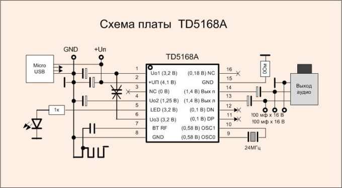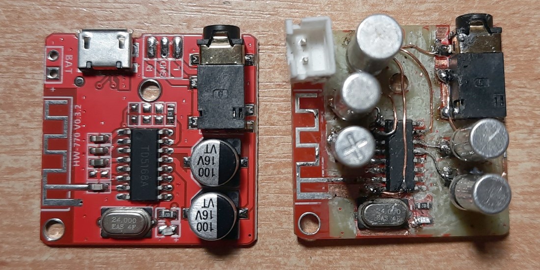 Оптимальной для модернизации является плата на микросхеме TD5168A. У нее малое число достаточно больших выводов к которым легко подпаивать провода. Кроме того, она работает с Bluetoth 5.0., что хорошо по минимальной задержке и минимальной компрессии сигнала в этом режиме. На Али-экспресс она стоит менее 100 рублей. На Озоне — 130 — 300 р. Внешний вид платы можно посмотреть по ссылке: