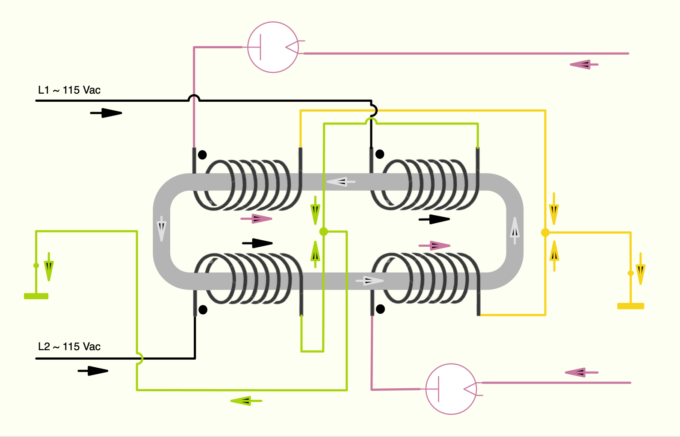Однако это не рабочая схема, рассмотрим первичку L1 и L2 — точки на катушках поставлены правильно, а соединение катушек не правильное. В таком соединении индуктивность первички будет = 0 и подключив черные выводы катушек к сети вы устроите короткое замыкание. одну из катушек надо переполюсовать, тогда все будет ок.