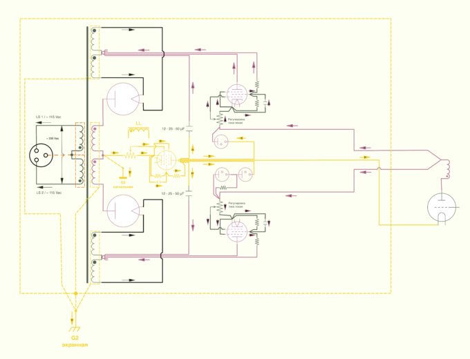Технически тут нет никаких сложностей, рассчеты все стандарные, единственно надо учитывать, что первичка намотана на одном плече магнитопровода, соответственно во вторичных обмотках в этом плече будет наводиться несколько большее напряжение, чем во вторичных обмотках на противоположном плече. Разница в пару процентов и ей на 100% можно пренебречь в анодной обмотке, однако для накалов и для входного напряжения стабилизатора надо получить минимально возможное рабочее напряжение максимально точно (чтобы продлить срок службы ламп и снизить температуру радиатора аналогового стабилизатора). Проблема в том, что для хорошего звука нужны старое железо и провода, при этом параметры старого железа никогда точно не известны а нужных диаметров проводов чаще всего нет. В итоге получаем много неопределенностей (читай — точно рассчитать невозможно) и единственный рабочий метод для низковольтных обмоток — это мотать их снаружи с запасом и делать отводы. Вы можете их увидеть на фото в статье — под некоторые участки обмоток подложена хб изолента, эти участки зачищены и залужены так, что можно уже на готовом аппарате точно установить нужное напряжение. схема Энергофона, на которой в объеме видно расположение обмоток и направлениеих намотки: