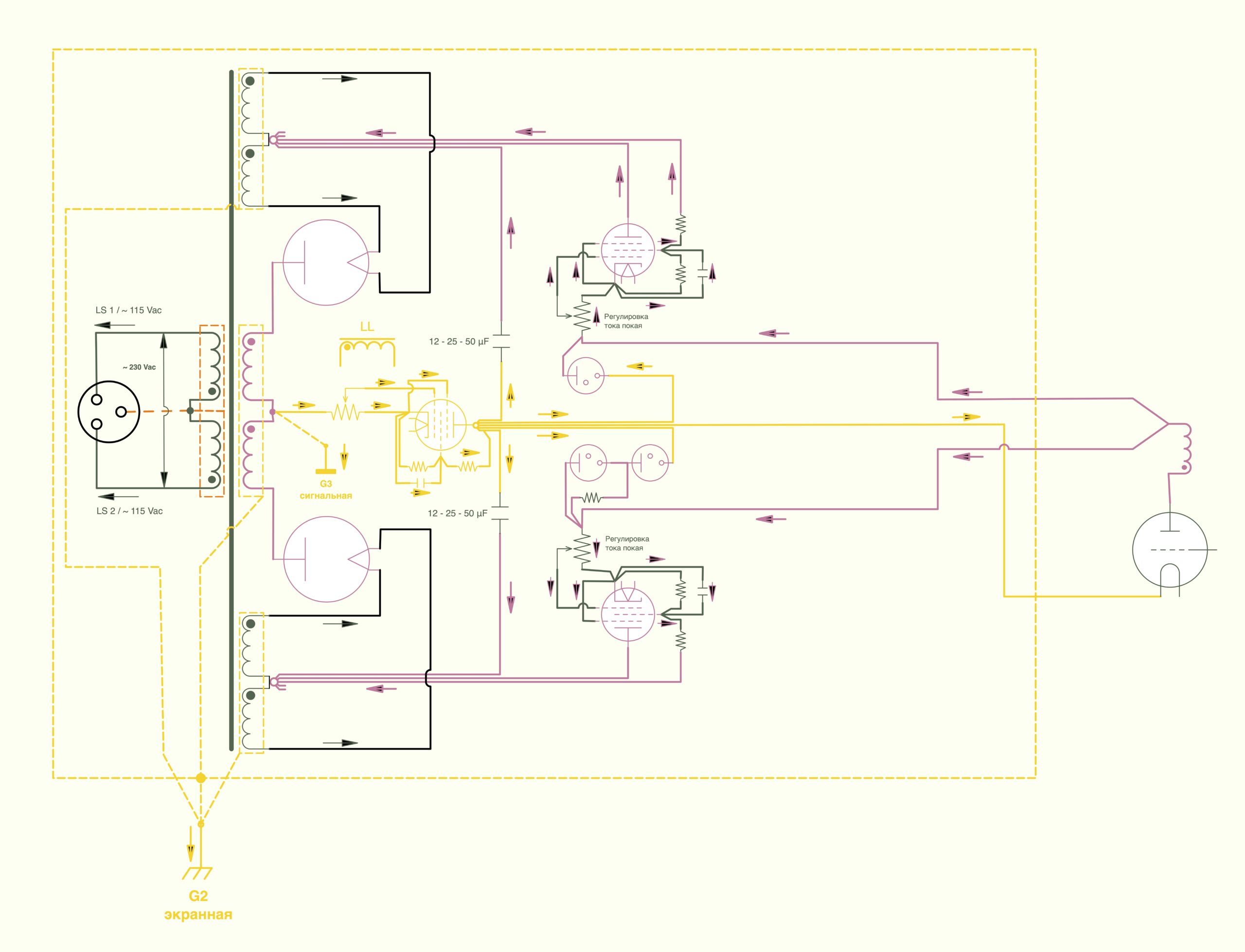Таким образом, с одной стороны, чтобы сделать трансформатор с чистым звуком необходимо чтобы все его обмотки были намотаны по правилу правой руки. С другой стороны, если мы взглянем на схему двухтактного усилителя, то увидим, что для соответствия направлений проводов трансформатора системе контуров, одну из обмоток придется мотать наоборот — по «правилу левой руки». В противном случае, если мы будем мотать обмотки по одному правилу, окажется нарушена система контуров.