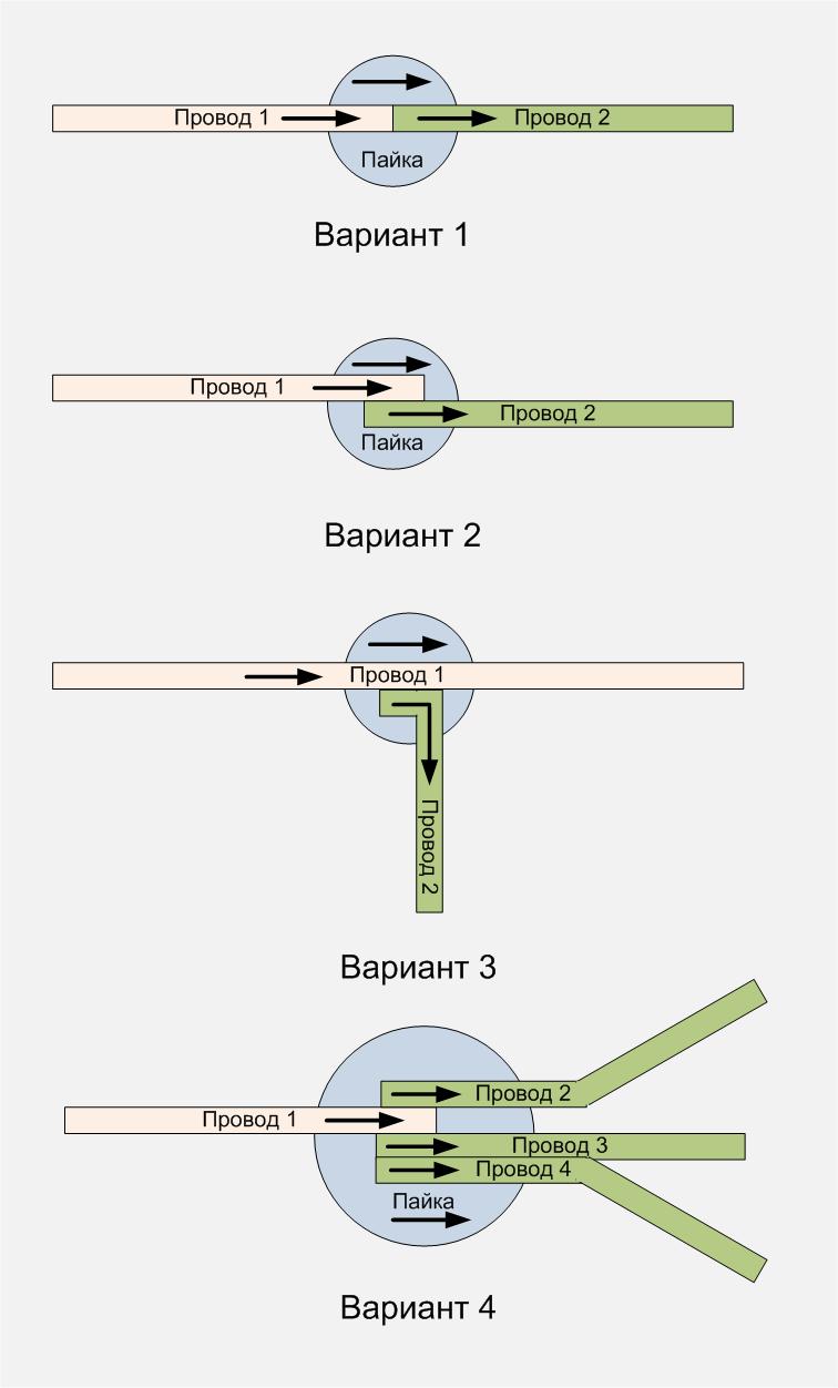 Первый вариант не оптимальный и не надежный, второй и третий — правильные, в четвертом провод 2 тоже должен быть внизу, при этом пример 4 практически невозможно распаять правильно, тк в идеале провода 2, 3 и 4 должны соединяться со вторым проводом в определенной схемой контуров последовательности, так же они касаться провода 1 напрямую, а не через соседний провод, как в случае с проводами 3 и 4.